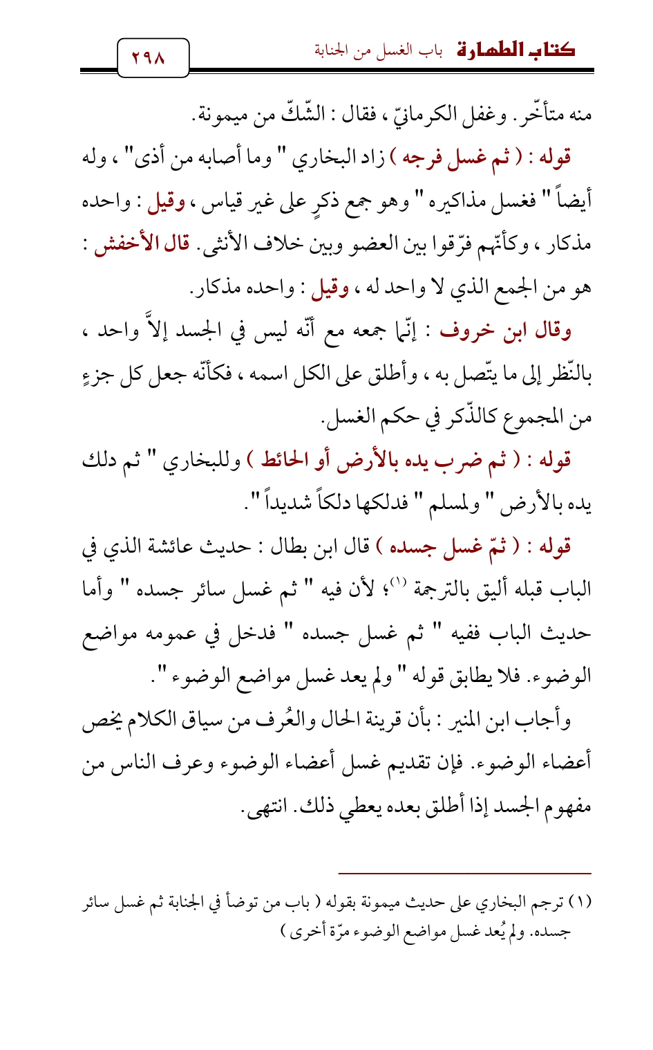 (¬1) ترجم البخاري على حديث ميمونة بقوله (باب من توضأ في الجنابة ثم غسل سائر جسده. ولم يُعد غسل مواضع الوضوء مرّة أخرى)