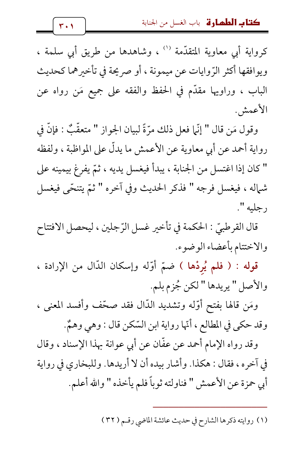 وقول مَن قال " إنّما فعل ذلك مرّةً لبيان الجواز " متعقّبٌ: فإنّ في رواية أحمد عن أبي معاوية عن الأعمش ما يدلّ على المواظبة، ولفظه " كان إذا اغتسل من الجنابة , يبدأ فيغسل يديه , ثمّ يفرغ بيمينه على شماله , فيغسل فرجه " فذكر الحديث وفي آخره " ثمّ يتنحّى فيغسل رجليه ".