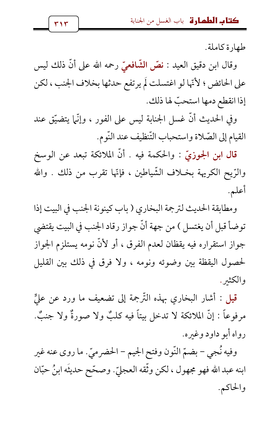 وقال ابن دقيق العيد: نصّ الشّافعيّ رحمه الله على أنّ ذلك ليس على الحائض؛ لأنّها لو اغتسلت لَم يرتفع حدثها بخلاف الجنب , لكن إذا انقطع دمها استحبّ لها ذلك.