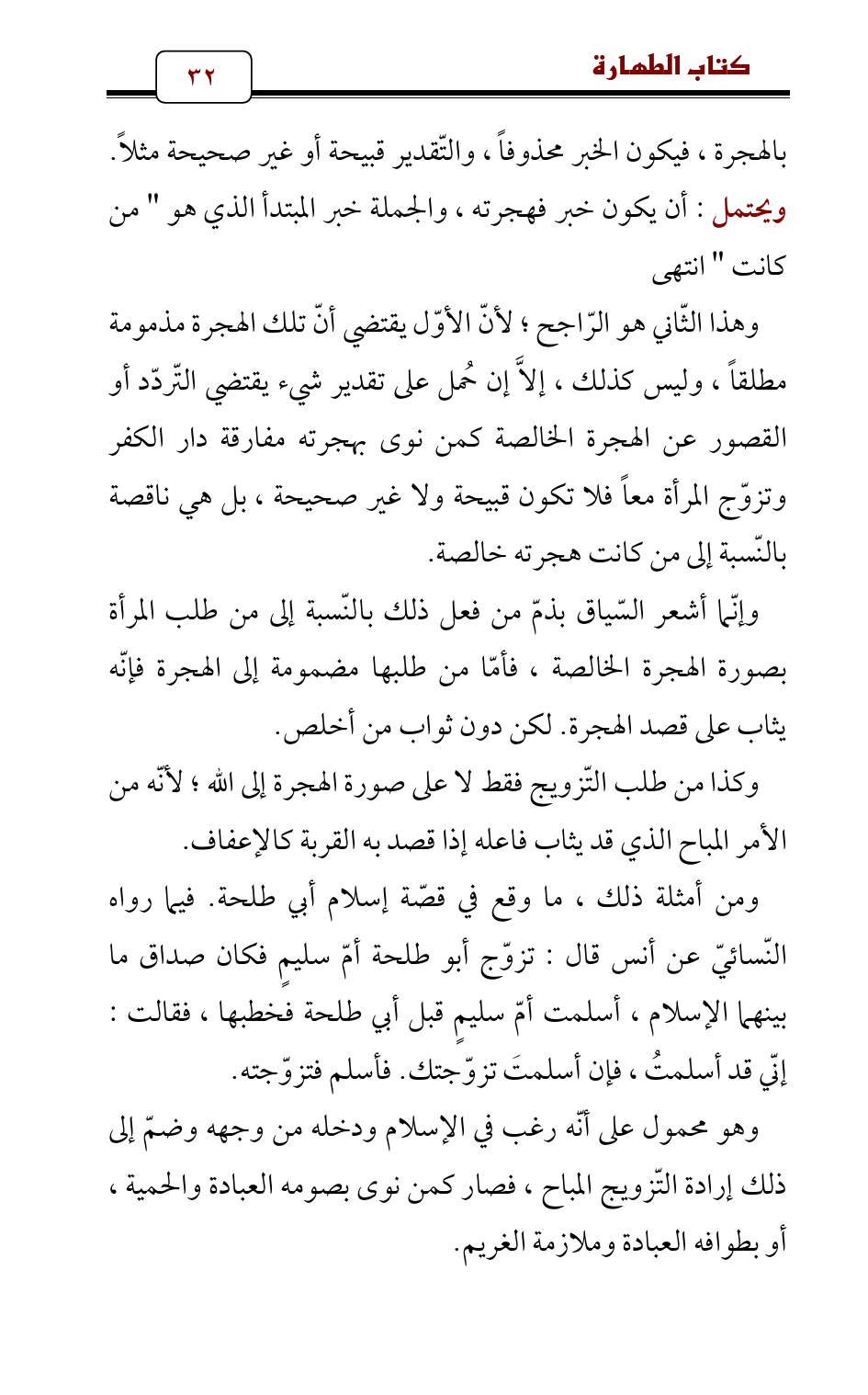وهذا الثّاني هو الرّاجح؛ لأنّ الأوّل يقتضي أنّ تلك الهجرة مذمومة مطلقاً، وليس كذلك، إلاَّ إن حُمل على تقدير شيء يقتضي التّردّد أو القصور عن الهجرة الخالصة كمن نوى بهجرته مفارقة دار الكفر وتزوّج المرأة معاً فلا تكون قبيحة ولا غير صحيحة، بل هي ناقصة بالنّسبة إلى من كانت هجرته خالصة.