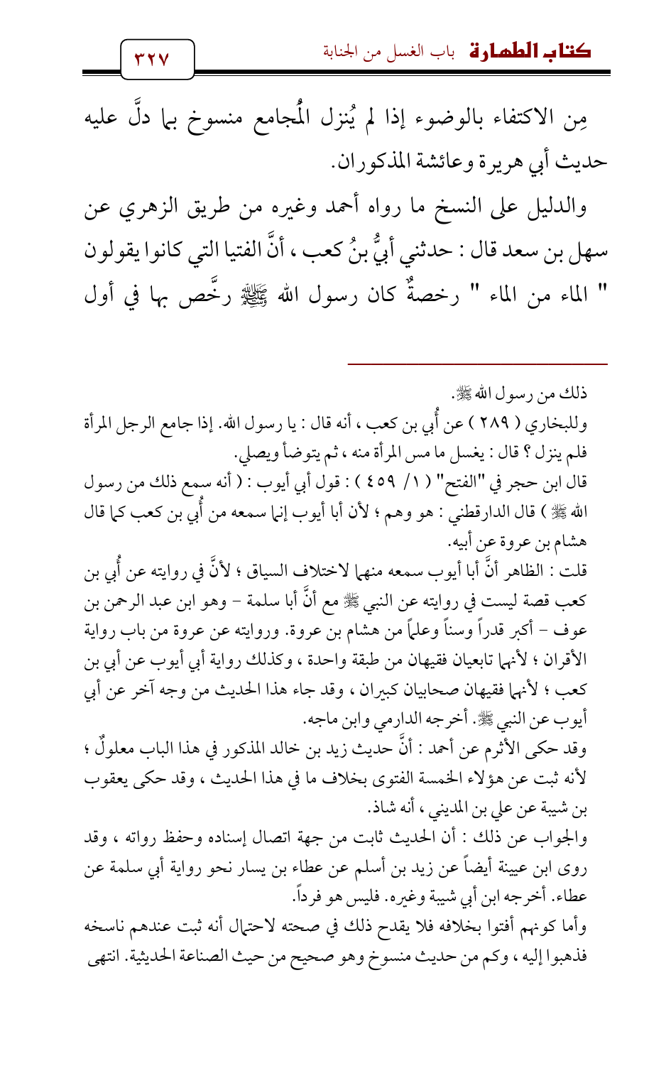 مِن الاكتفاء بالوضوء إذا لم يُنزل الْمُجامع منسوخ بما دلَّ عليه حديث أبي هريرة وعائشة المذكوران.