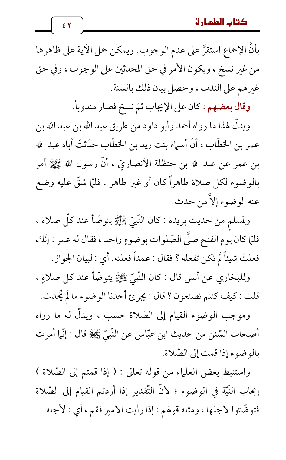 ويدلّ لهذا ما رواه أحمد وأبو داود من طريق عبد الله بن عبد الله بن عمر بن الخطّاب , أنّ أسماء بنت زيد بن الخطّاب حدّثتْ أباه عبد الله بن عمر عن عبد الله بن حنظلة الأنصاريّ , أنّ رسول الله - صلى الله عليه وسلم - أمر بالوضوء لكل صلاة طاهراً كان أو غير طاهر، فلمّا شقّ عليه وضع عنه الوضوء إلاَّ من حدث.
