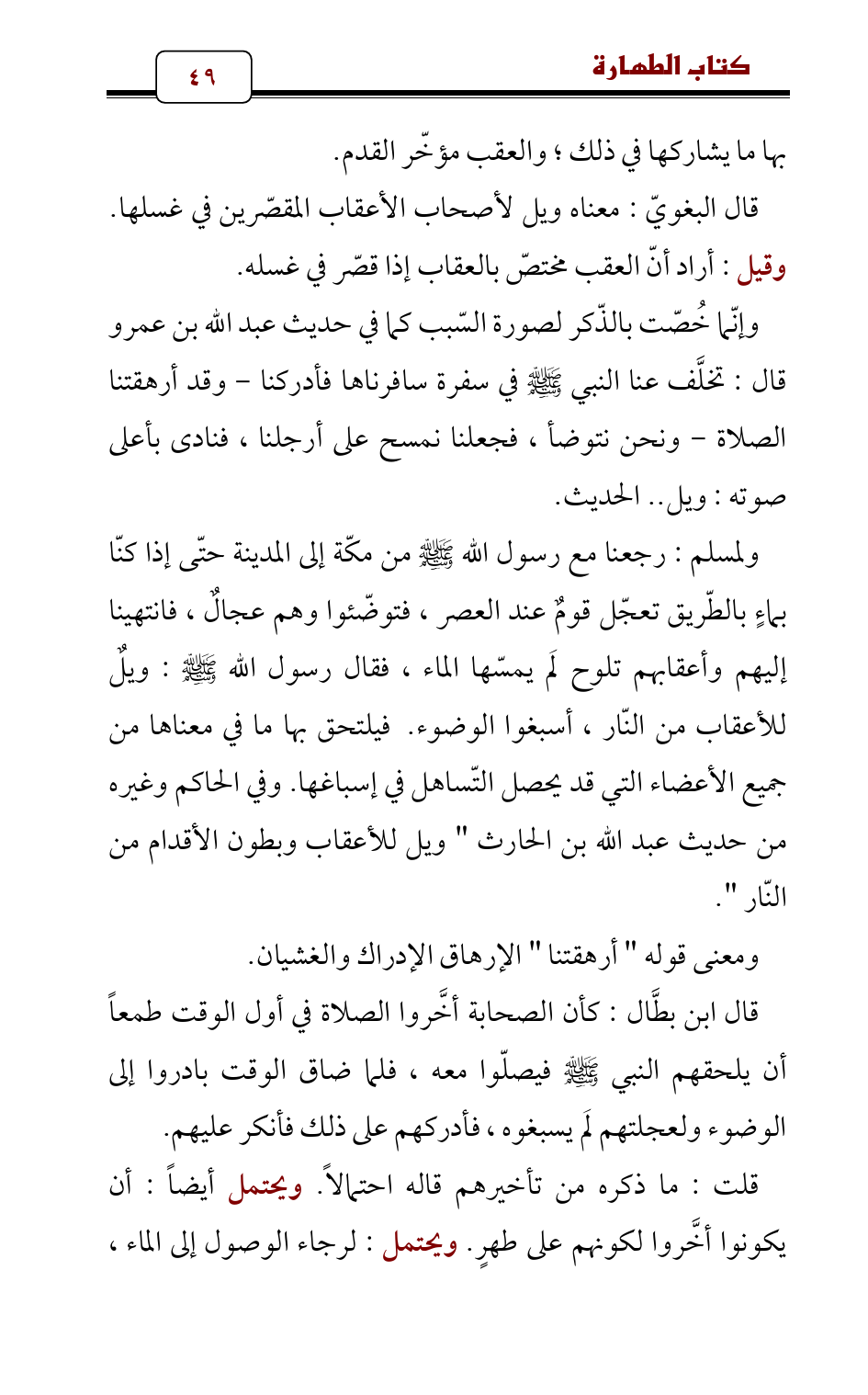ولمسلم: رجعنا مع رسول الله - صلى الله عليه وسلم - من مكّة إلى المدينة حتّى إذا كنّا بماءٍ بالطّريق تعجّل قومٌ عند العصر، فتوضّئوا وهم عجالٌ , فانتهينا إليهم وأعقابهم تلوح لَم يمسّها الماء , فقال رسول الله - صلى الله عليه وسلم -: ويلٌ للأعقاب من النّار , أسبغوا الوضوء. فيلتحق بها ما في معناها من جميع الأعضاء التي قد يحصل التّساهل في إسباغها. وفي الحاكم وغيره من حديث عبد الله بن الحارث " ويل للأعقاب وبطون الأقدام من النّار ".
