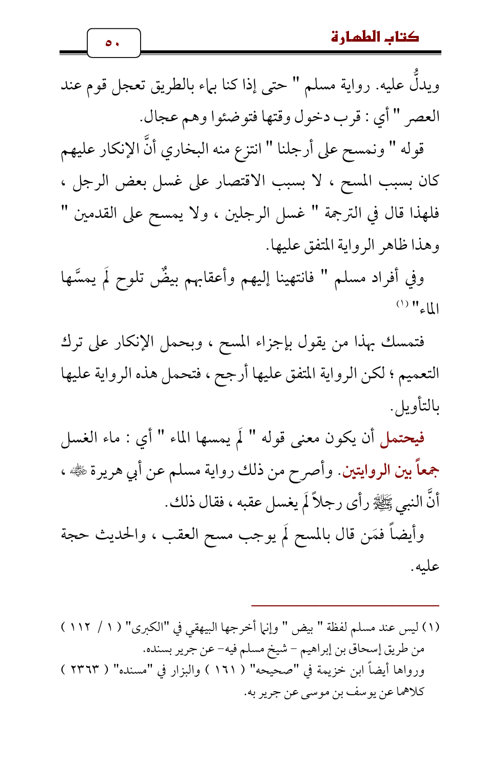 وفي أفراد مسلم " فانتهينا إليهم وأعقابهم بيضٌ تلوح لَم يمسَّها الماء " (¬1)