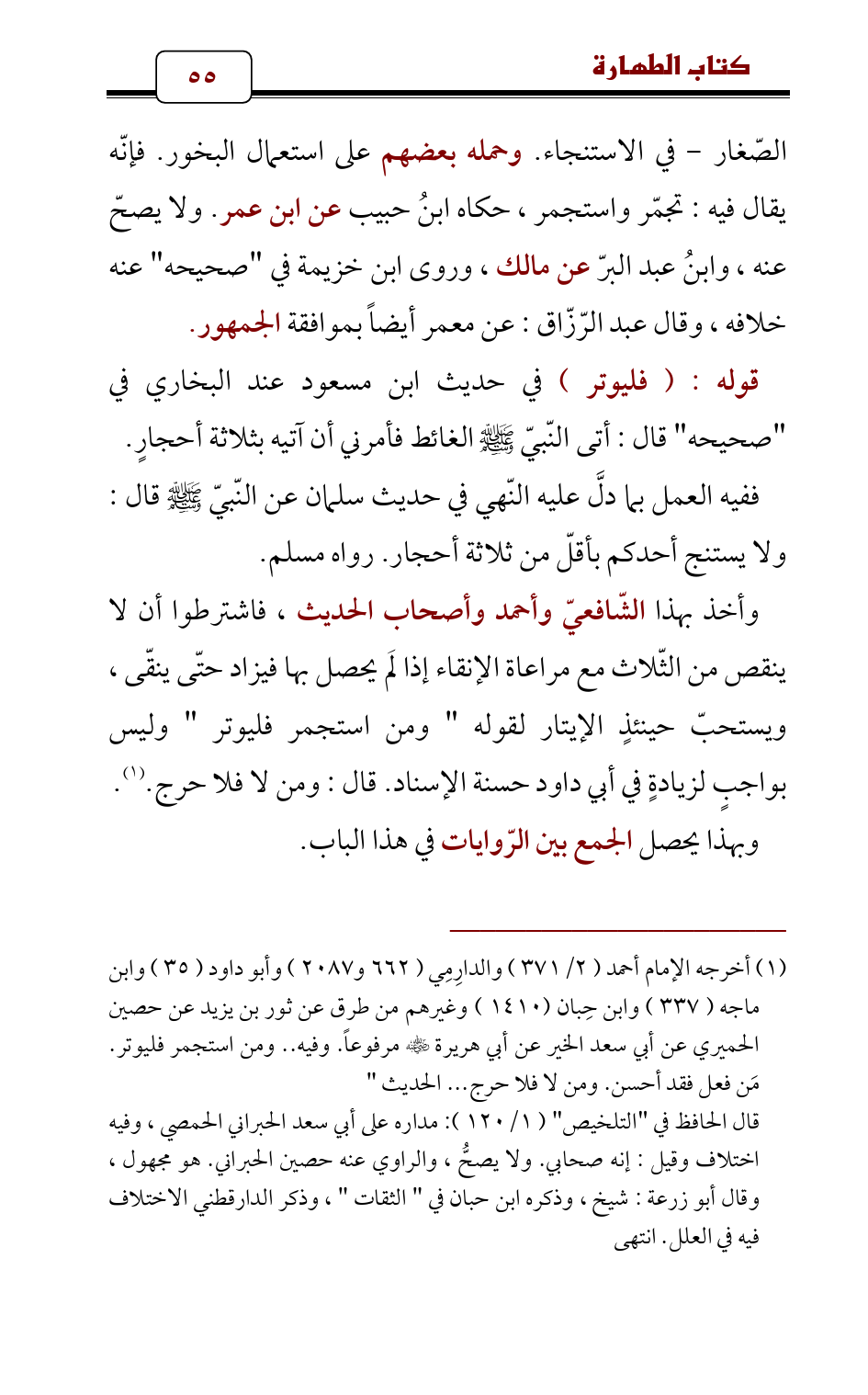 (¬1) أخرجه الإمام أحمد (2/ 371) والدارِمِي (662 و2087) وأبو داود (35) وابن ماجه (337) وابن حِبان (1410) وغيرهم من طرق عن ثور بن يزيد عن حصين الحميري عن أبي سعد الخير عن أبي هريرة - رضي الله عنه - مرفوعاً. وفيه .. ومن استجمر فليوتر. مَن فعل فقد أحسن. ومن لا فلا حرج ... الحديث "
