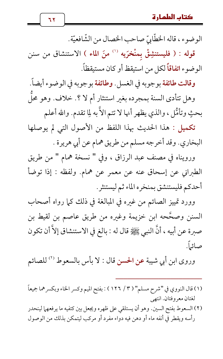 (¬2) السعوط بفتح السين. وهو أن يستلقي على ظهره ويجعل بين كتفيه ما يرفعهما لينحدر رأسه ويقطر في أنفه ماء أو دهن فيه دواء مفرد أو مركب ليتمكن بذلك من الوصول إلى دماغه لاستخراج ما فيه من الداء بالعطاس. قاله ابن حجر في " الفتح ".