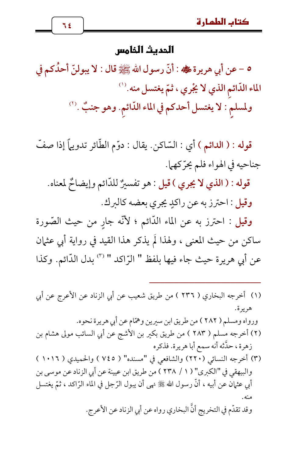 5 - عن أبي هريرة - رضي الله عنه -: أنّ رسول الله - صلى الله عليه وسلم - قال: لا يبولنّ أحدُكم في الماء الدّائمِ الذي لا يجْري , ثمّ يغتسل منه. (¬1)