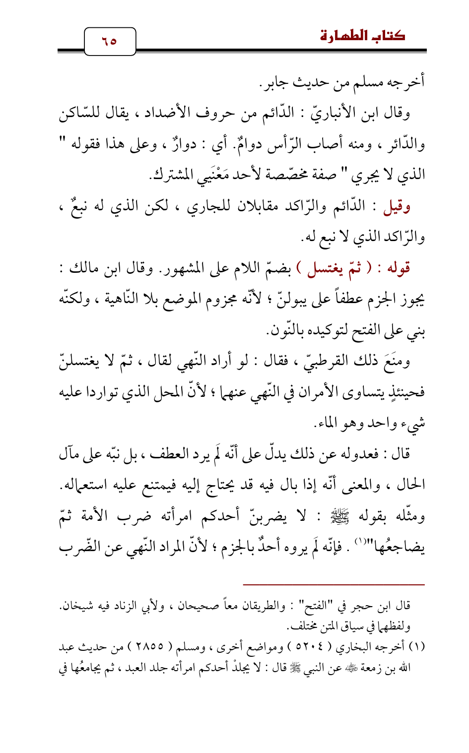 قال: فعدوله عن ذلك يدلّ على أنّه لَم يرد العطف , بل نبّه على مآل الحال , والمعنى أنّه إذا بال فيه قد يحتاج إليه فيمتنع عليه استعماله. ومثّله بقوله - صلى الله عليه وسلم -: لا يضربنّ أحدكم امرأته ضرب الأمة ثمّ يضاجعُها " (¬1). فإنّه لَم يروه أحدٌ بالجزم؛ لأنّ المراد النّهي عن الضّرب