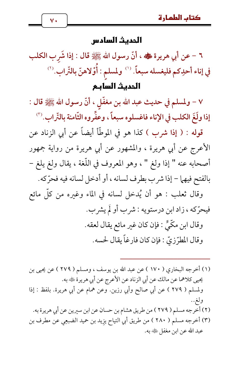 6 - عن أبي هريرة - رضي الله عنه - , أنّ رسول الله - صلى الله عليه وسلم - قال: إذا شَرِب الكلب في إناء أحدِكم فليغسله سبعاً. (¬1) ولمسلمٍ: أُوْلاهنّ بالتّراب. (¬2)