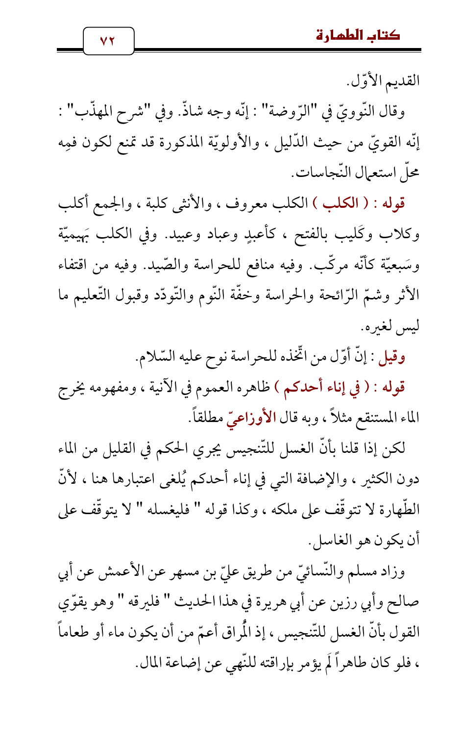 قوله: (الكلب) الكلب معروف , والأنثى كلبة , والجمع أكلب وكلاب وكَليب بالفتح، كأعبدٍ وعباد وعبيد. وفي الكلب بَهيميّة وسَبعيّة كأنّه مركّب. وفيه منافع للحراسة والصّيد. وفيه من اقتفاء الأثر وشمّ الرّائحة والحراسة وخفّة النّوم والتّودّد وقبول التّعليم ما ليس لغيره.