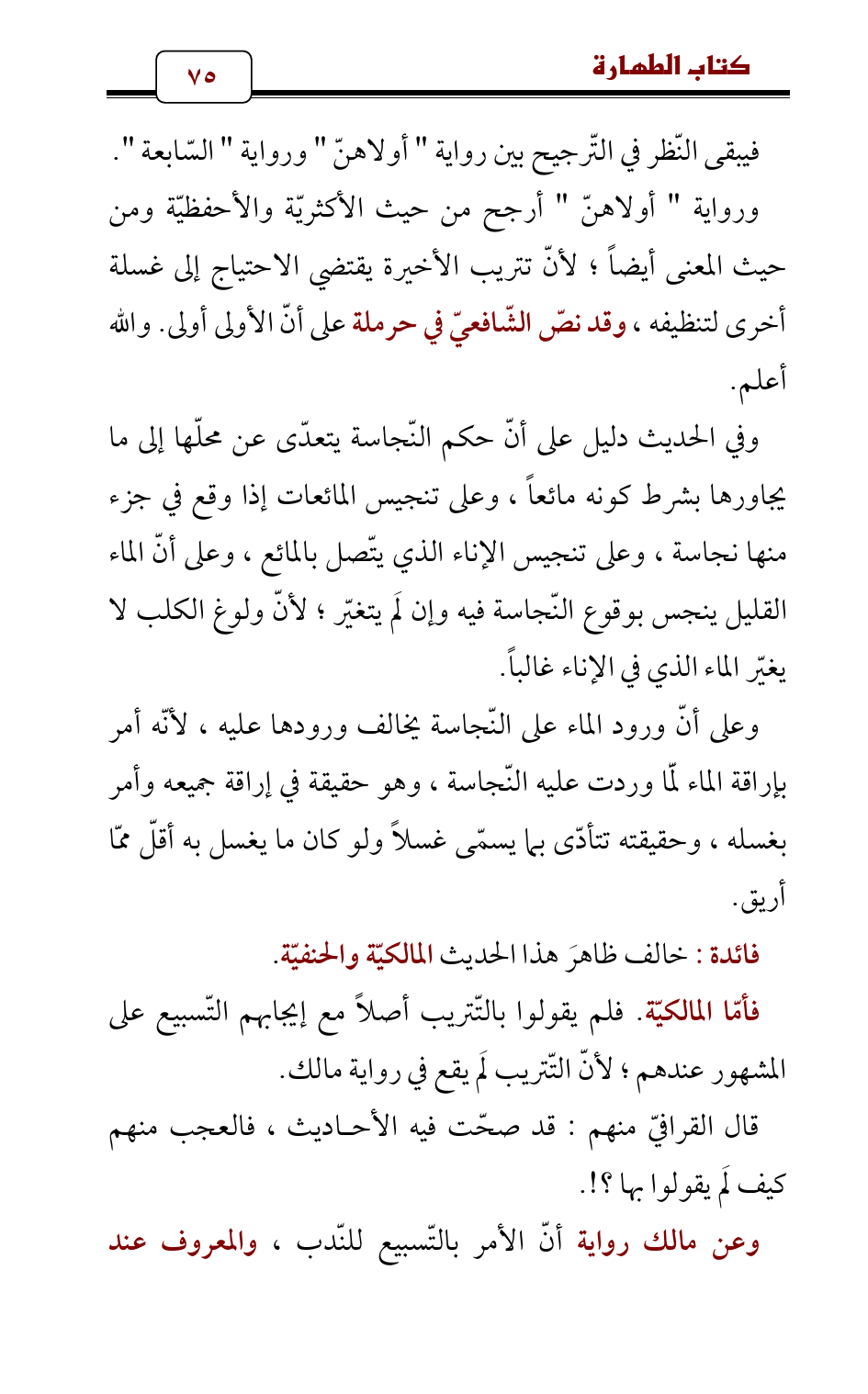 ورواية " أولاهنّ " أرجح من حيث الأكثريّة والأحفظيّة ومن حيث المعنى أيضاً؛ لأنّ تتريب الأخيرة يقتضي الاحتياج إلى غسلة أخرى لتنظيفه، وقد نصّ الشّافعيّ في حرملة على أنّ الأولى أولى. والله أعلم.