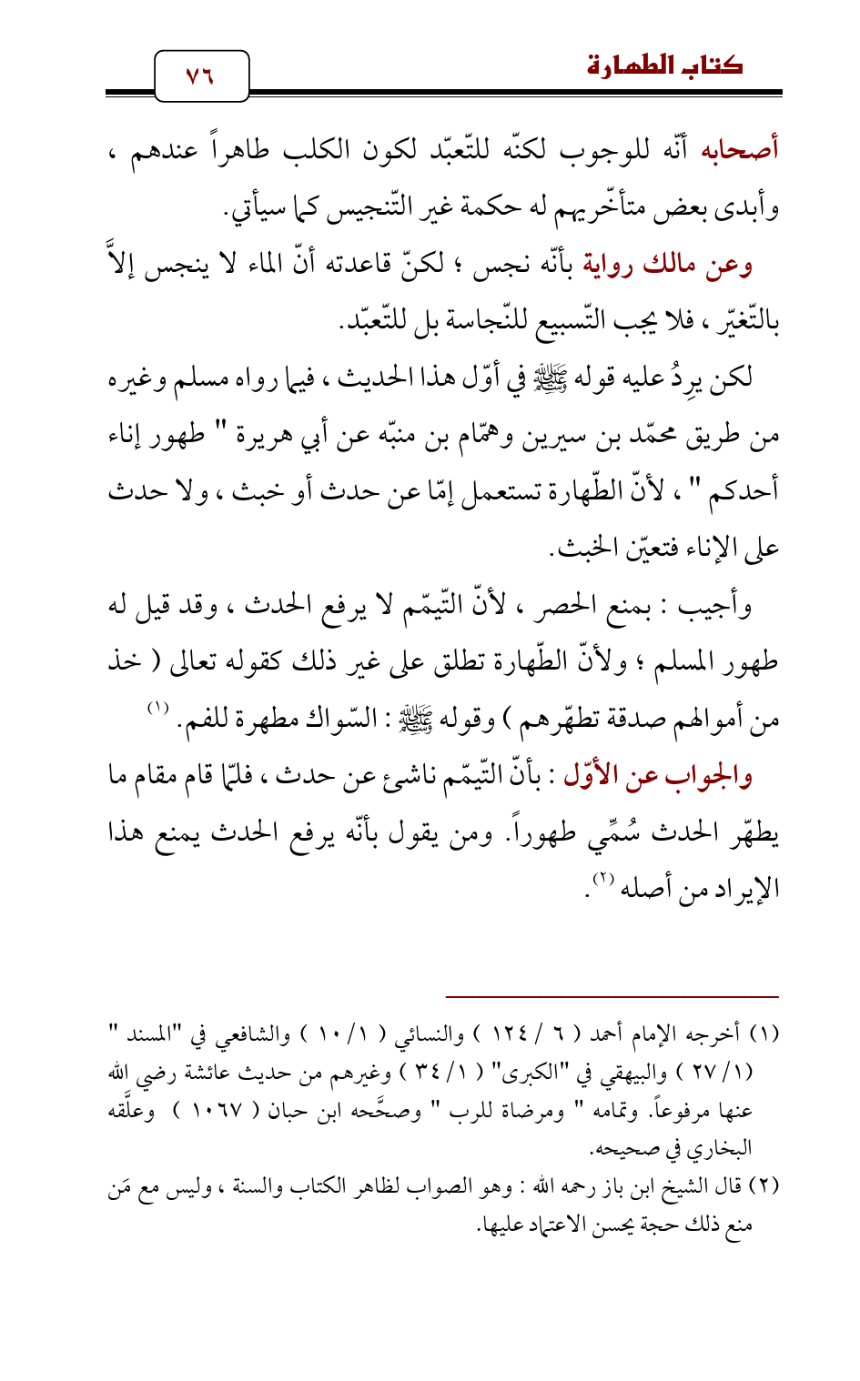 وأجيب: بمنع الحصر , لأنّ التّيمّم لا يرفع الحدث , وقد قيل له طهور المسلم؛ ولأنّ الطّهارة تطلق على غير ذلك كقوله تعالى (خذ من أموالهم صدقة تطهّرهم) وقوله - صلى الله عليه وسلم -: السّواك مطهرة للفم. (¬1)