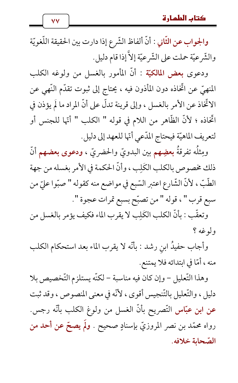 ودعوى بعض المالكيّة: أنّ المأمور بالغسل من ولوغه الكلب المنهيّ عن اتّخاذه دون المأذون فيه , يحتاج إلى ثبوت تقدّم النّهي عن الاتّخاذ عن الأمر بالغسل، وإلى قرينة تدلّ على أنّ المراد ما لَم يؤذن في اتّخاذه؛ لأنّ الظّاهر من اللام في قوله " الكلب " أنّها للجنس أو لتعريف الماهيّة فيحتاج المدّعي أنّها للعهد إلى دليل.