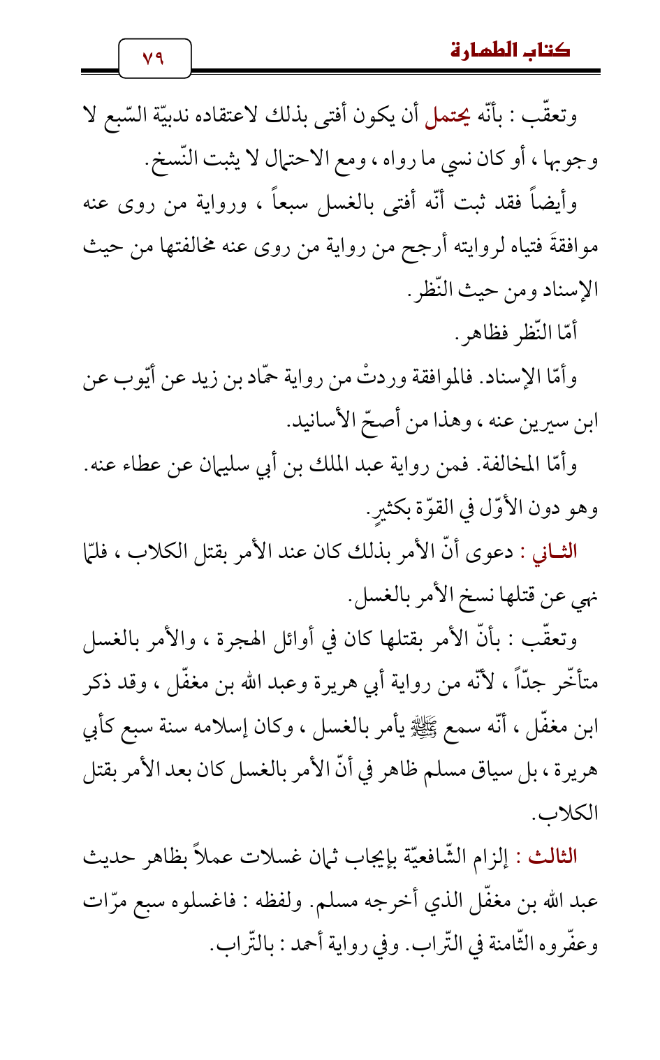 وأيضاً فقد ثبت أنّه أفتى بالغسل سبعاً , ورواية من روى عنه موافقةَ فتياه لروايته أرجح من رواية من روى عنه مخالفتها من حيث الإسناد ومن حيث النّظر.