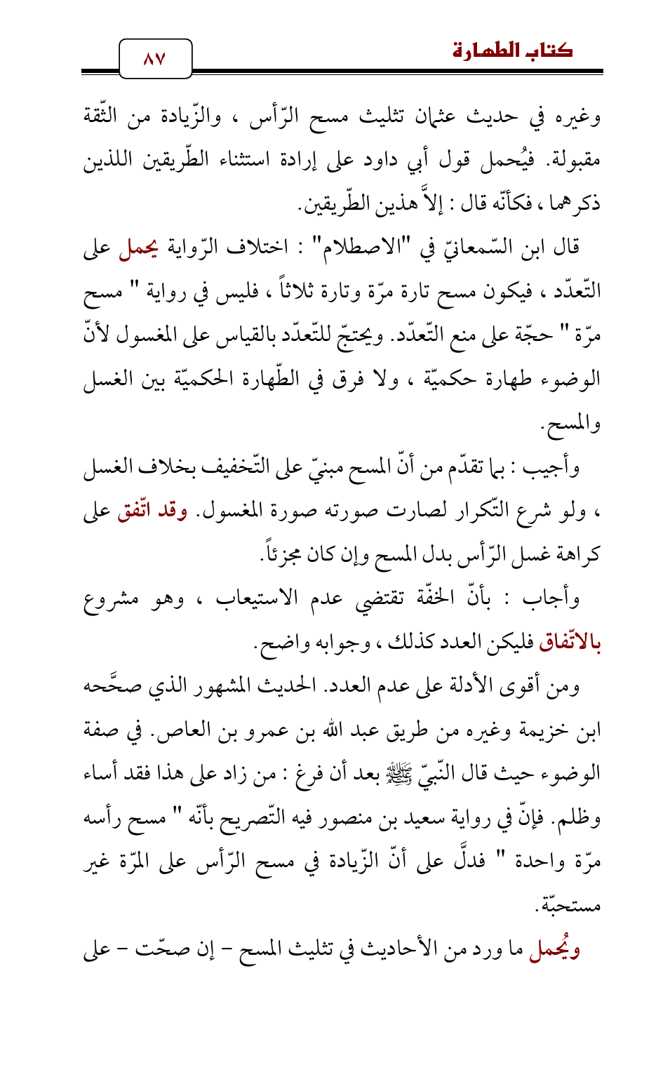 ويُحمل ما ورد من الأحاديث في تثليث المسح - إن صحّت - على