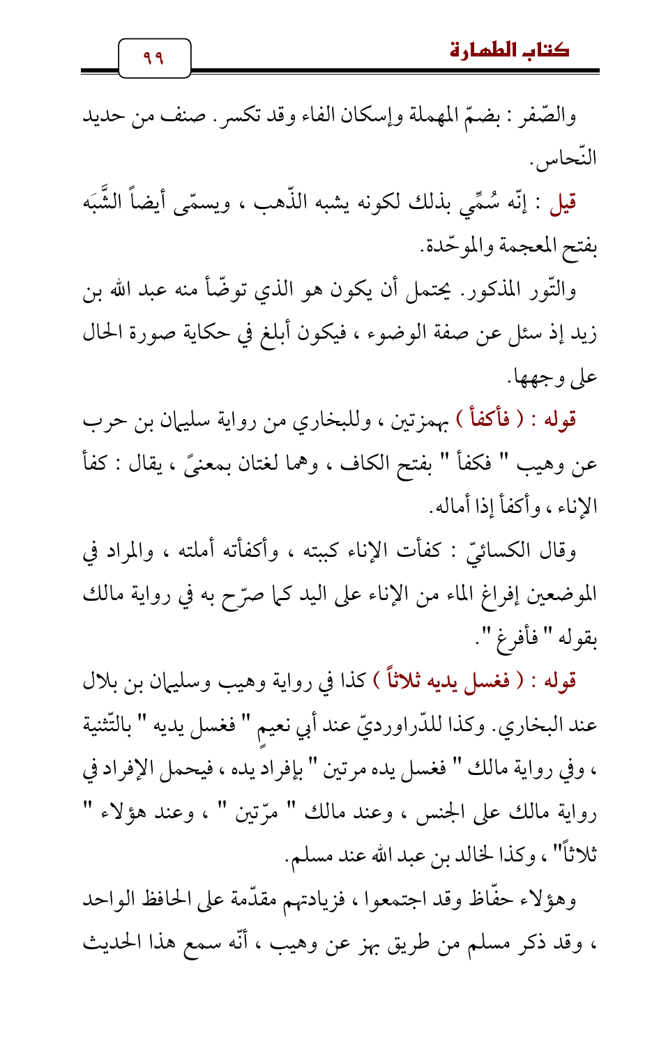 وقال الكسائيّ: كفأت الإناء كببته , وأكفأته أملته، والمراد في الموضعين إفراغ الماء من الإناء على اليد كما صرّح به في رواية مالك بقوله " فأفرغ ".