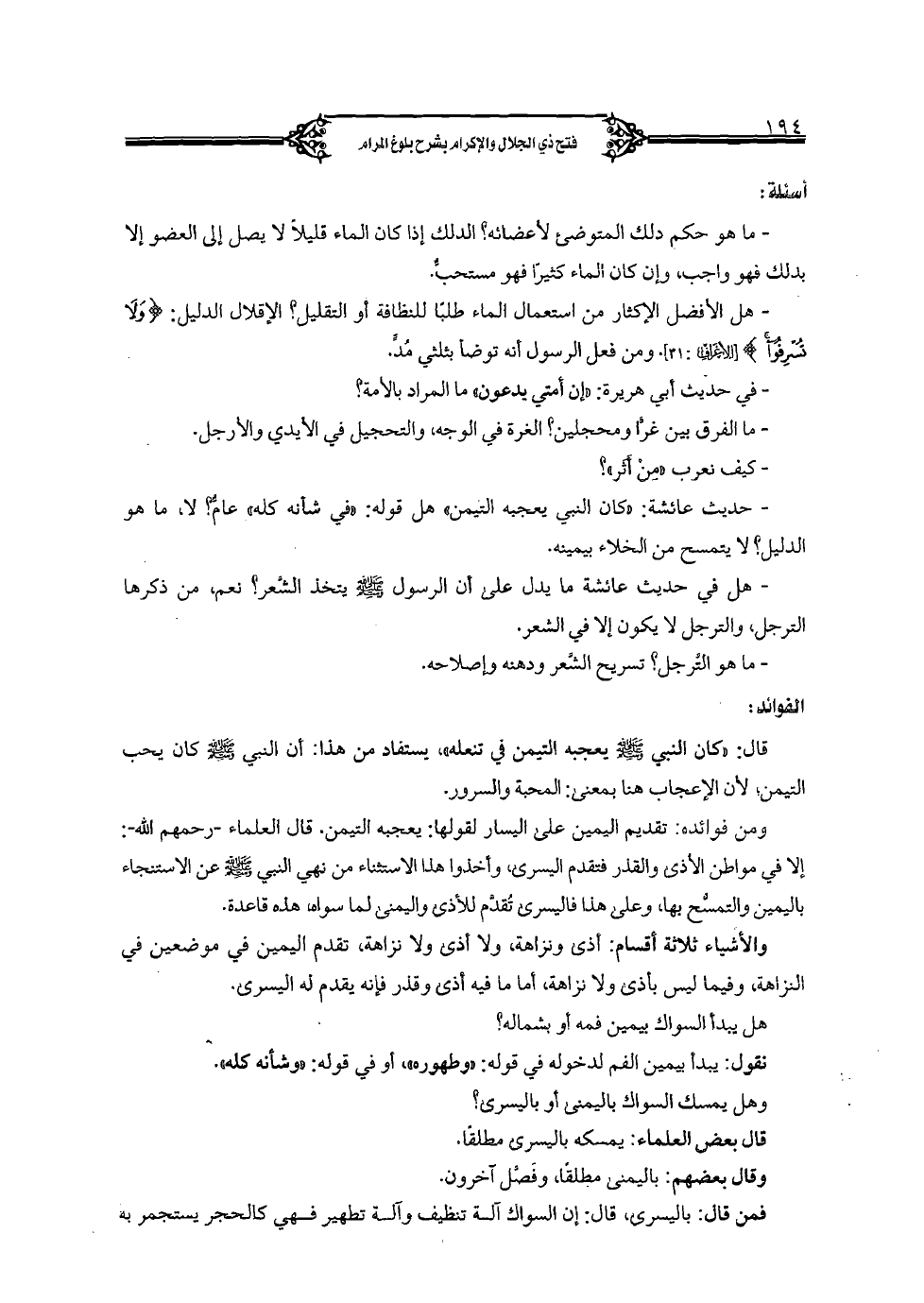 ومن فوائده: تقديم اليمين على اليسار لقولها: يعجبه التيمن. قال العلماء - رحمهم الله-: إلا في مواطن الأذى والقذر فتقدم اليسرى، وأخذوا هذا الاستثناء من نهي النبي صلى الله عليه وسلم عن الاستنجاء باليمين والتمسح بها، وعلى هذا فاليسرى تقدم للأذى واليمنى لما سواه، هذه قاعدة.