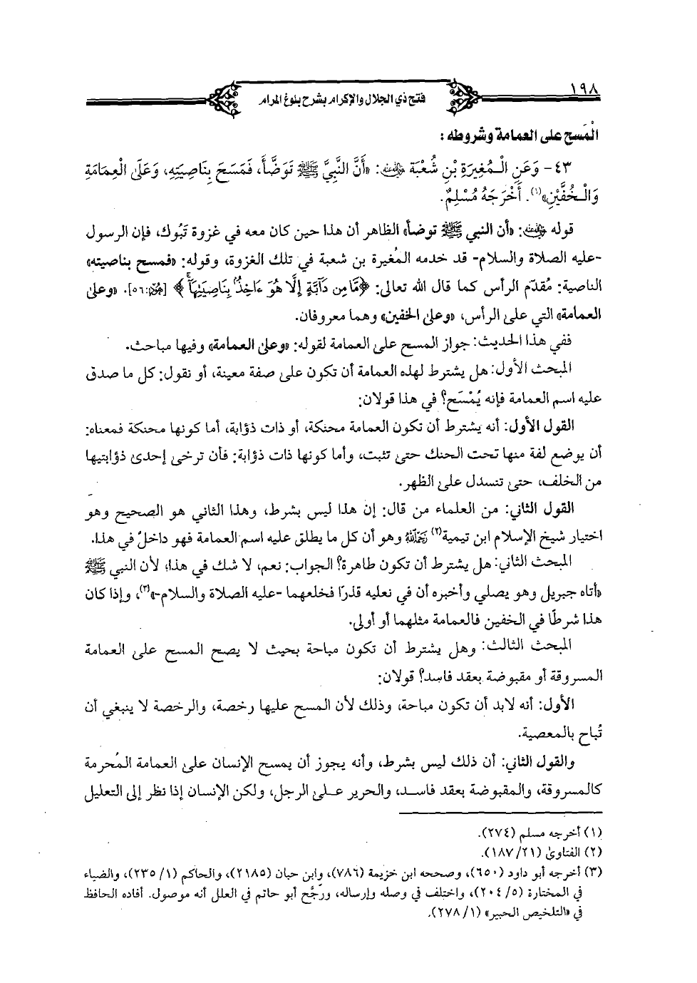 43 - وعن المغيرة بن شعبة رضي الله عنه: "أن النبي صلى الل عليه وسلم توضأ، فمسح بناصيته، وعلى العمامة والخفين". أخرجه مسلم.