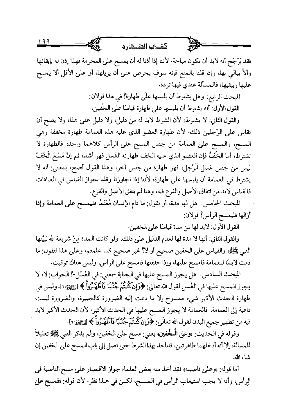 والقول الثاني: لا يشترط؛ لأن الشرط لابد له من دليل، ولا دليل على هذا، ولا يصح أن تقاس على الرجلين ذلك؛ لأن طهارة العضو الذي عليه هذه العمامة طهارة مخففة وهي المسح، والمسح على العمامة من جنس المسح على الرأس كلاهما واحد، فالطهارة لا تشترط، أما الخف فإن العضو الذي عليه الخف طهارته الغسل فهو أشد، ثم إن مسح الخف ليس من جنس غسل الرجل، فهو طهارة من جنس آخر، وهذا القول أصح، بمعنى: أنه لا يشترط في العمامة أن يلبسها على طهارة؛ لأننا إذا تجاوزنا وقلنا بجواز القياس في العبادات فالقياس لابد من اتفاق الأصل والفرع فيه، وهنا لم يتفق الأصل والفرع.
