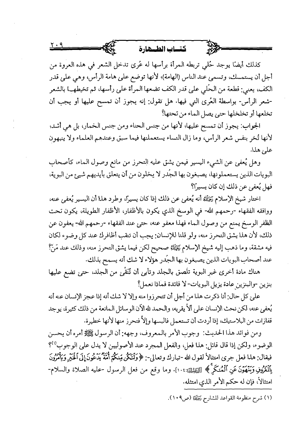 كذلك أيضا يوجد حلي تربطه المرأة برأسها له عرى تدخل الشعر في هذه العروة من أجل أن يستمسك، وتسمى عند الناس (الهامة)؛ لأنها توضع على هامة الرأس، وهي على قدر الكف، يعني: قطعة من الحلي على قدر الكف تضعها المرأة على رأسها، ثم تخيطها بالشعر - شعر الرأس- بواسطة العرى التي فيها. هل نقول: إنه يجوز أن تمسح عليها أو يجب أن تخلعها أو تخلخلها حتى يصل الماء من تحتها؟
