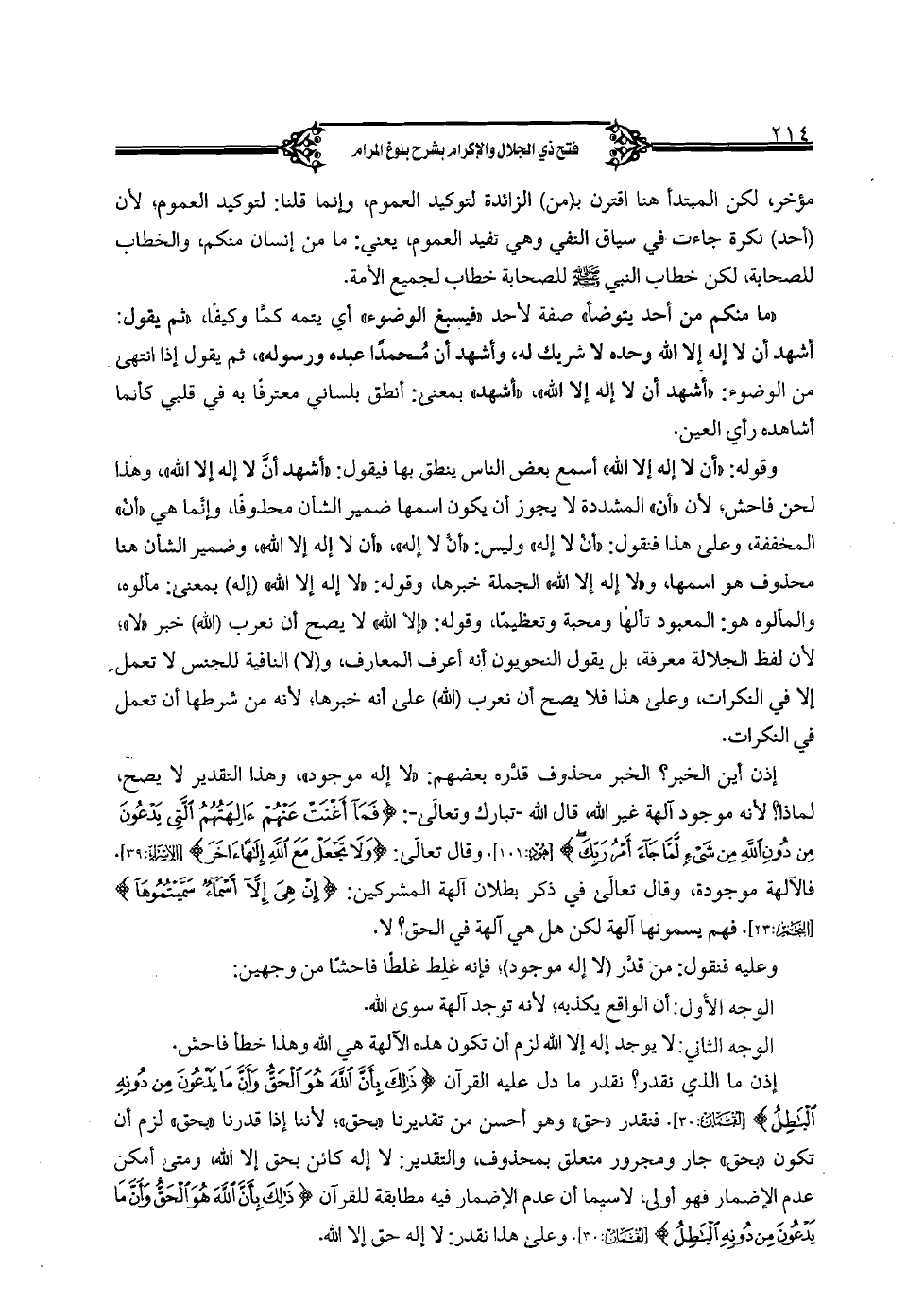 إذن أين الحبر؟ الخبر محذوف قدره بعضهم: "لا إله موجود"، وهذا التقدير لا يصح، لماذا؟ لأنه موجود آلهة غير الله، قال الله - تبارك وتعالى-: {فما أغنت عنهم ءالهتهم التي يدعون من دون الله من شيء لما جاء أمر ربك} [هود: 101]. وقال تعالى: {ولا تجعل مع الله إلها ءاخر} [الإسراء: 39].
