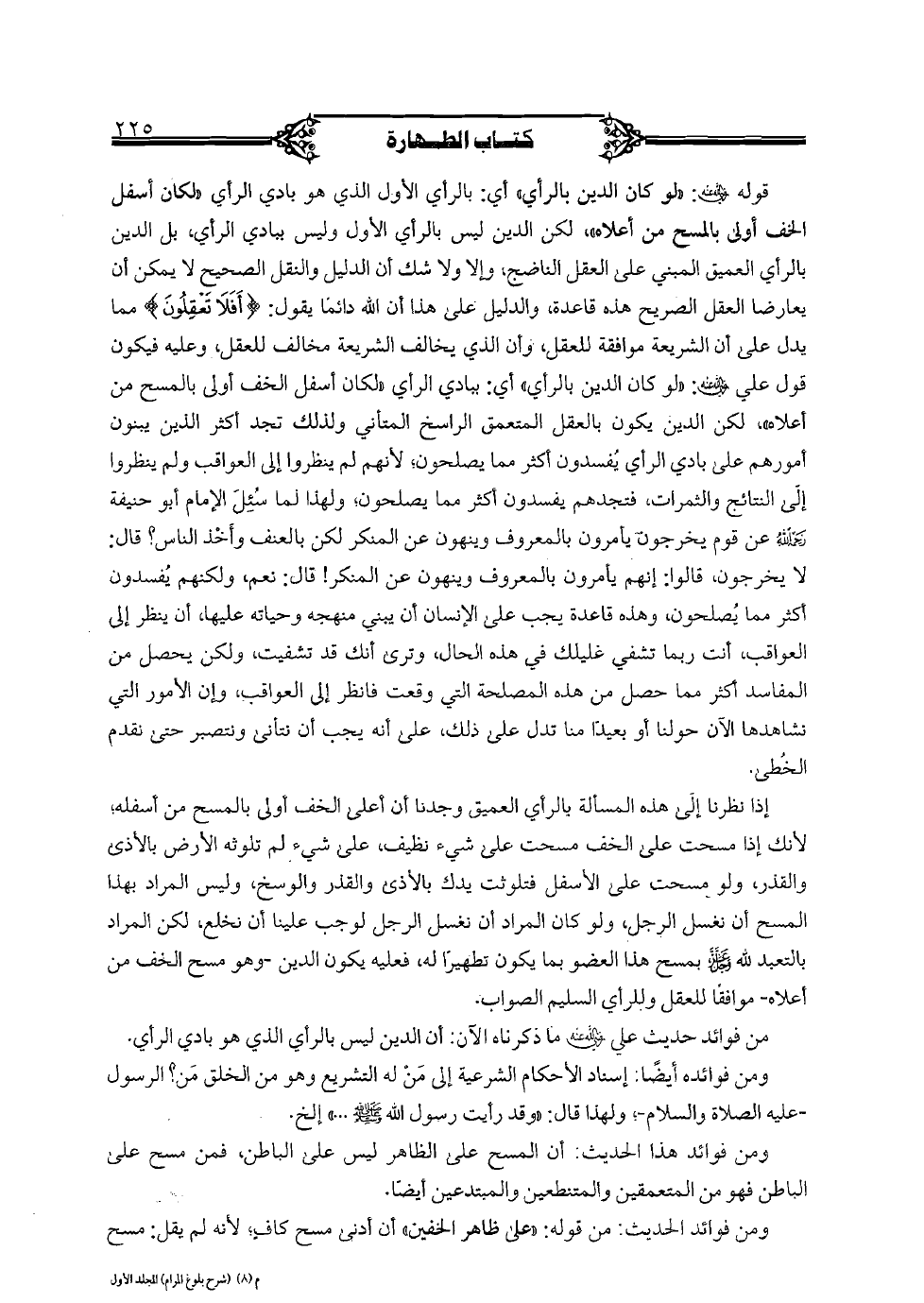 قوله رضي الله عنه: "لو كان الدين بالرأي" أي: بالرأي الأول الذي هو بادي الرأي "لكان أسفل الخف أولى بالمسح من أعلاه"، لكن الدين ليس بالرأي الأول وليس ببادي الرأي؛ بل الدين بالرأي العميق المبني على العقل الناضج؛ وإلا ولا شك أن الدليل والنقل الصحيح لا يمكن أن يعارضا العقل الصريح هذه قاعدة، والدليل على هذا أن الله دائما يقول: {أفلا تعقلون} مما يدل على أن الشريعة موافقة للعقل، وأن الذي يخالف الشريعة مخالف للعقل، وعليه فيكون قول علي رضي الله عنه: "لو كان الدين بالرأي" أي: بيادي الرأي "لكان أسفل الخف أولى بالمسح من أعلاه"، لكن الدين يكون بالعقل المتعمق الراسخ المتأني ولذلك تجد أكثر الذين يبنون أمورهم على بادي الرأي يفسدون أكثر مما يصلحون؛ لأنهم لم ينظروا إلى العواقب ولم ينظروا إلى النتائج والثمرات، فتجدهم يفسدون أكثر مما يصلحون؛ ولهذا لما سئل الإمام أبو حنيفة رحمه الله عن قوم يخرجون يأمرون بالمعروف وينهون عن المنكر لكن بالعنف وأخذ الناس؟ قال: لا يخرجون، قالوا: إنهم يأمرون بالمعروف وينهون عن المنكر! قال: نعم، ولكنهم يفسدون أكثر مما يصلحون، وهذه قاعدة يجب على الإنسان أن يبني منهجه عليها، أن ينظر إلى العواقب، أنت ربما تشفي غليلك في هذه الحال، وترى أنك قد تشفيت، ولكن يحصل من المفاسد أكثر مما حصل من هذه المصلحة التي وقعت فانظر إلى العواقب، وإن الأمور التي نشاهدها الآن حولنا أو بعيدا منا تدل على ذلك، على أنه يجب أن نتأنى ونتصبر حتى نقدم الخطى.