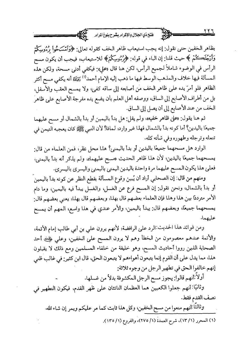 ومن فوائد هذا الحديث: الرد على الرافضة؛ لأنهم يرون علي بن أبي طالب إمام الأئمة، والأئمة عندهم معصومون من الخطأ وهم لا يرون المسح على الخفين، وعلي رضي الله عنه أحد الصحابة الذين رووا أحاديث المسح، وهو خليفة من خلفاء المسلمين ومع ذلك لا يقبلون هذا، مما يدل على أن القوم إنما يتبعون أهواءهم لا يتبعون الحق، قال ابن كثير: في غالب ظني إنهم خالفوا الحق في تطهير الرجل من وجوه ثلاثة: