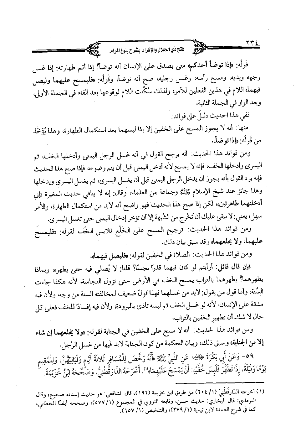 59 - وعن أبي بكر رضي الله عنه عن النبي صلى الله عليه وسلم "أنه رخص للمسافر ثلاثة أيتام ولياليهن، وللمقيم يوما وليلة، إذا تطهر فلبس خفيه: أن يمسح عليهما". أخرجه الدارقطني، وصححه ابن خزيمة.