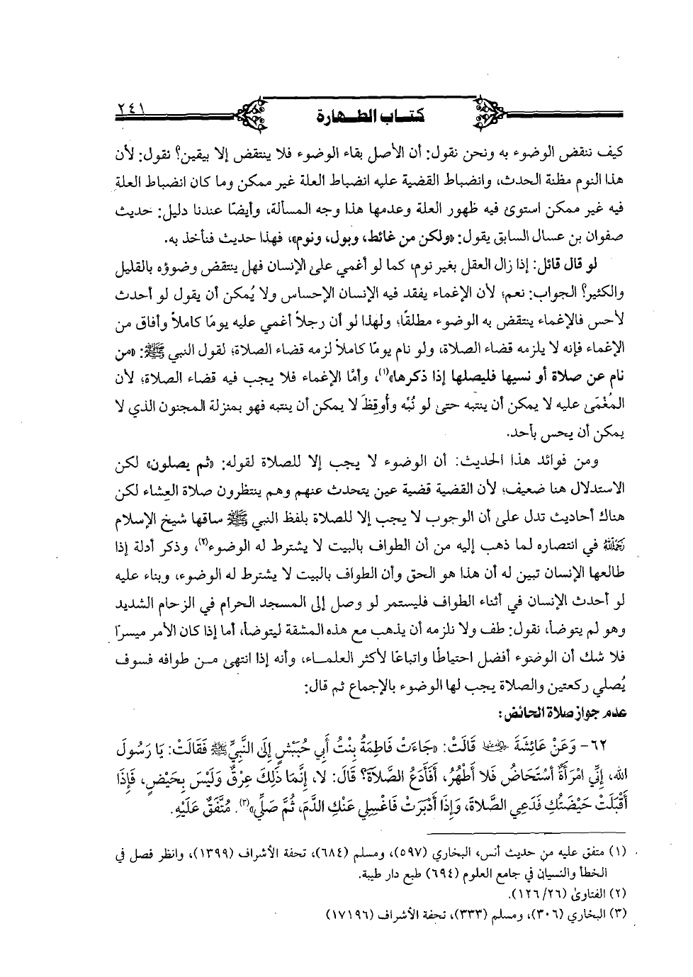 62 - وعن عائشة رضي الله عنها قالت: "جاءت فاطمة بنت أبي حيبش إلى النبي صلى الله عليه وسلم فقالت: يا رسول الله، إني امرأة أستحاض فلا أطهر، أفأدع الصلاة؟ قال: لا، إنما ذلك عرق وليس بحيض، فإذا أقبلت حيضتك فدعي الصلاة، وإذا أدبرت فاغسلي عنك الدم، ثم صلي". متفق عليه.