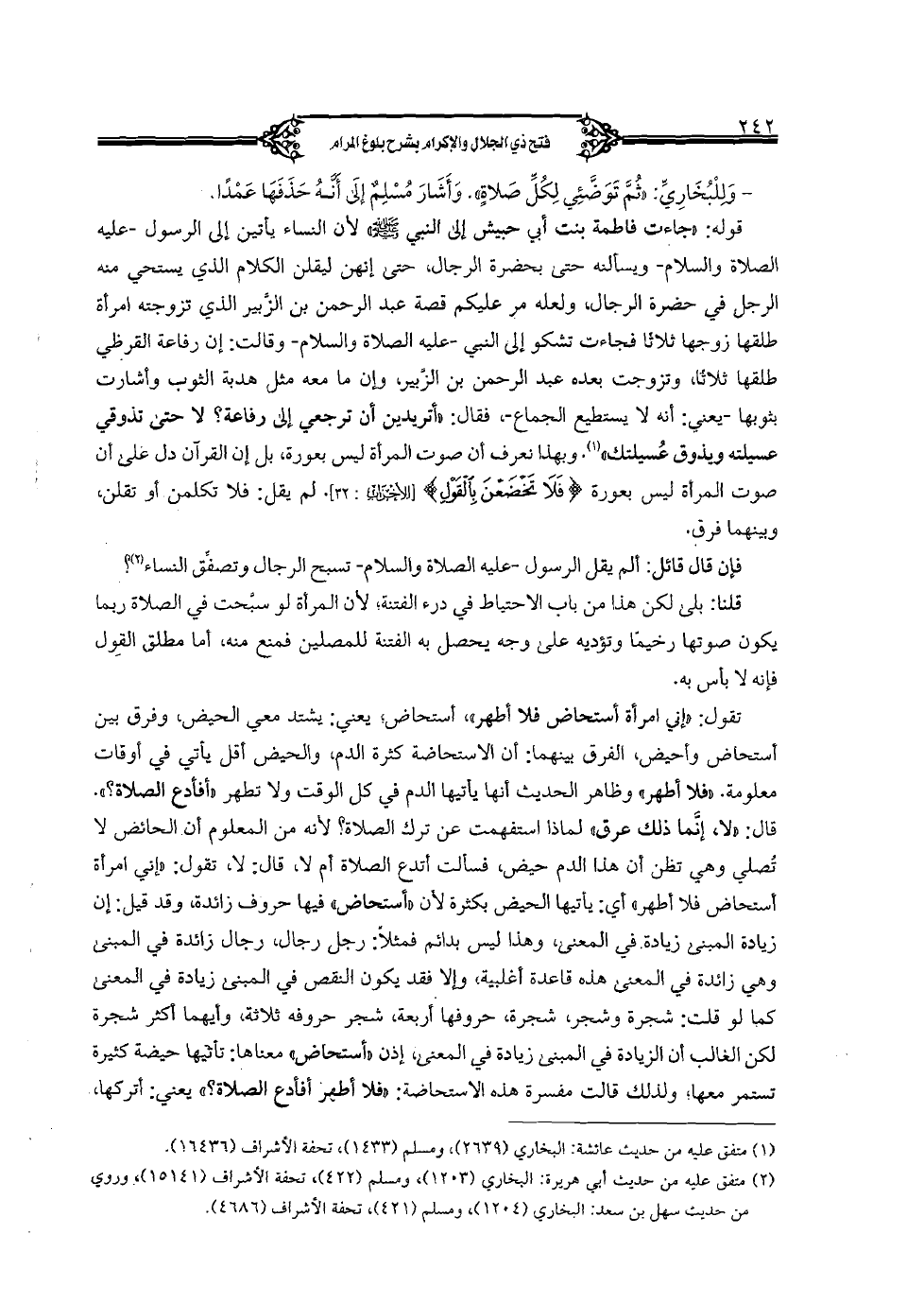 قوله: "جاءت فاطمة بنت أبي حبيش إلى النبي صلى الله عليه وسلم" لأن النساء يأتين إلى الرسول - عليه الصلاة والسلام- ويسألنه حتى بحضرة الرجال، حتى إنهن ليقلن الكلام الذي يستحي منه الرجل في حضرة الرجال؛ ولعله مر عليكم قصة عبد الرحمن بن الزبير الذي تزوجته امرأة طلقها زوجها ثلاثا فجاءت تشكو إلى النبي - عليه الصلاة والسلام- وقالت: إن رفاعة القرظي طلقها ثلاثا، وتزوجت بعده عبد الرحمن بن الزبير، وإن ما معه مثل هدبة الثوب وأشارت بثوبها - يعني: أنه لا يستطيع الجماع-، فقال: "أتريدين أن ترجعي إلى رفاعة؟ لا حتى تذوقي عسيلته ويذوق عسيلتك". وبهذا نعرف أن صوت المرأة ليس بعورة، بل إن القرآن دل على أن صوت المرأة ليس بعورة {فلا تخضعن بالقول} [الأحزاب: 32]. لم يقل: فلا تكملن أو تقلن، وبينهما فرق.