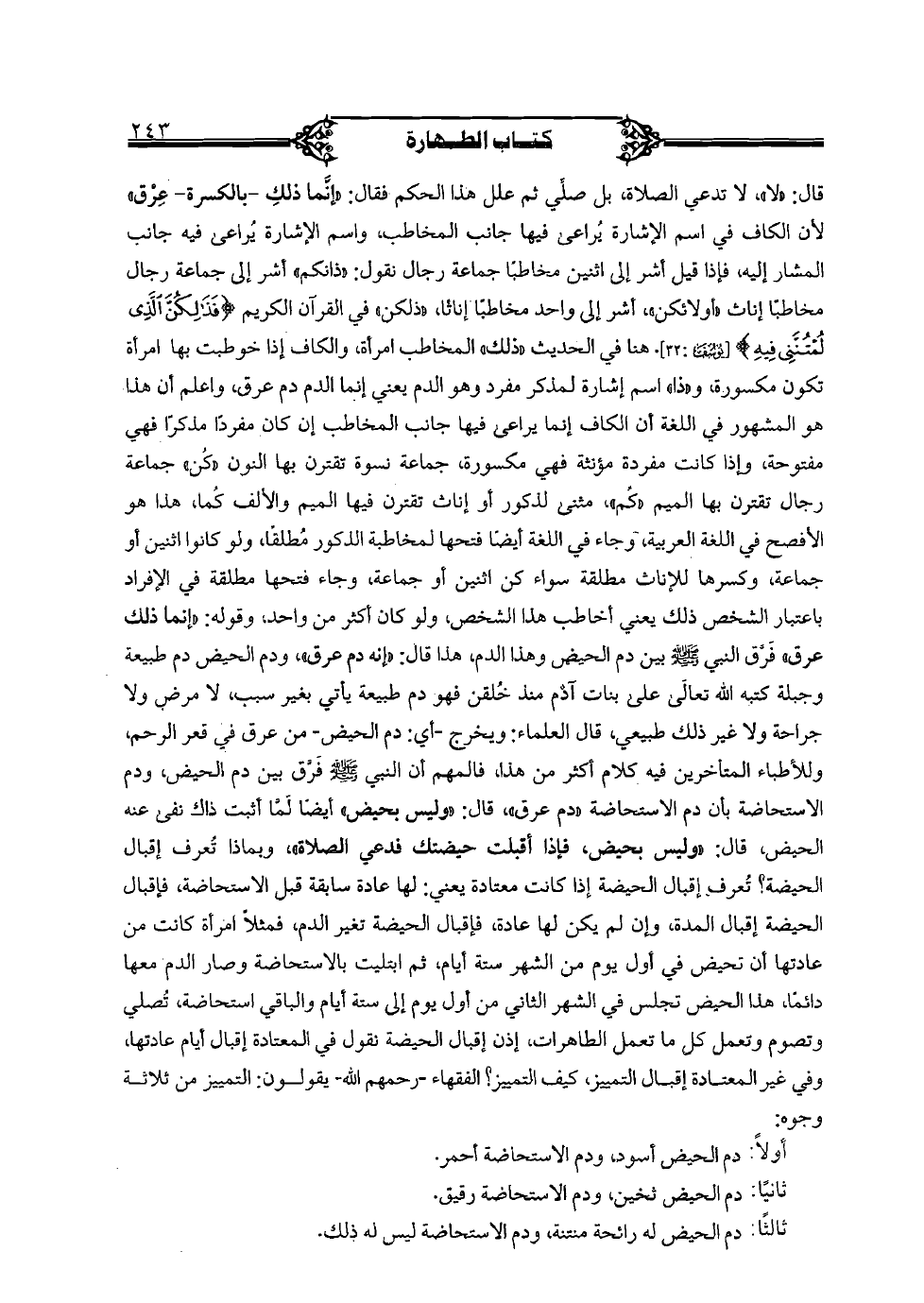 قال: "لا"، لا تدعي الصلاة، بل صلي ثم علل هذا الحكم فقال: "إنما ذلك - بالكسرة- عرق" لأن الكاف في اسم الإشارة يراعى فيها جانب المخاطب، واسم الإشارة يراعى فيه جانب المشار إليه، فإذا قيل أشر إلى اثنين مخاطبا جماعة رجال نقول: "ذانكم" أشر إلى جماعة رجال مخاطبا إناث "أولائكن"، أشر إلى واحد مخاطبا إناثا، "ذلكن" في القرآن الكريم {فذلكن الذي لمتنني فيه} [يوسف: 32]. هنا في الحديث "ذلك" المخاطب امرأة، والكاف إذا خوطبت بها امرأة تكون مكسورة، و"ذا" اسم إشارة لمذكر مفرد وهو الدم يعني إنما الدم دم عرق، واعلم أن هذا هو المشهور في اللغة أن الكاف إنما يراعى فيها جانب المخاطب إن كان مفردا مذكرا فهي مفتوحة، وإذا كانت مفردة مؤنثة فهي مكسورة، جماعة نسوة تقترن بها النون "كن" جماعة رجال تقترن بها الميم "كم"، مثنى لذكور أو إناث تقترن فيها الميم والألف كما، هذا هو الأفصح في اللغة العربية، وجاء في اللغة أيضا فتحها لمخاطبة الذكور مطلقا، ولو كانوا اثنين أو جماعة، وكسرها للإناث مطلقة سواء كن اثنين أو جماعة، وجاء فتحها مطلقة في الإفراد باعتبار الشخص ذلك يعني أخاطب هاذ الشخص، ولو كان أكثر من واحد، وقوله: "إنما ذلك عرق" فرق النبي صلى الله عليه وسلم بين دم الحيض وهذا الدم، هذا قال: "إنه دم عرق"، ودم الحيض دم طبيعة وجبلة كتبه الله تعالى على بنات آدم منذ خلقهن فهو دم طبيعة يأتي بغير سبب، لا مرض ولا جراحة ولا غير ذلك طبيعي، قال العلماء: ويخرج - أي: دم الحيض- من عرق في قعر الرحم، وللأطباء المتأخرين فيه كلام أكثر من هذا، فالمهم أن النبي صلى الله عليه وسلم فرق بين دم الحيض، ودم الاستحاضة بأن دم الاستحاضة "دم عرق"، قال: "وليس بحيض" أيضا لما أثبت ذاك نفى عنه الحيض، قال: "وليس بحيض، فإذا أقبلت حيضتك فدعي الصلاة"، وبماذا تعرف إقبال الحيضة؟ تعرف إقبال الحيضة إذا كانت معتادة يعني: لها عادة سابقة قبل الاستحاضة، فإقبال الحيضة إقبال المدة، وإن لم يكن لها عادة، فإقبال الحيضة تغير الدم، فمثلا امرأة كانت من عادتها أن تحيض في أول يوم من الشهر ستة أيام، ثم ابتليت بالاستحاضة وصار الدم معها دائما، هذا الحيض تجلس في الشهر الثاني من أول يوم إلى ستة أيام والباقي استحاضة، تصلي وتصوم وتعمل كل ما تعمل الطاهرات، إذن إقبال الحيضة نقول في المعتادة إقبال أيام عادتها، وفي غير المعتاد إقبال التمييز، كيف التمييز؟ الفقهاء - رحمهم الله- يقولون: التمييز من ثلاثة وجوه: