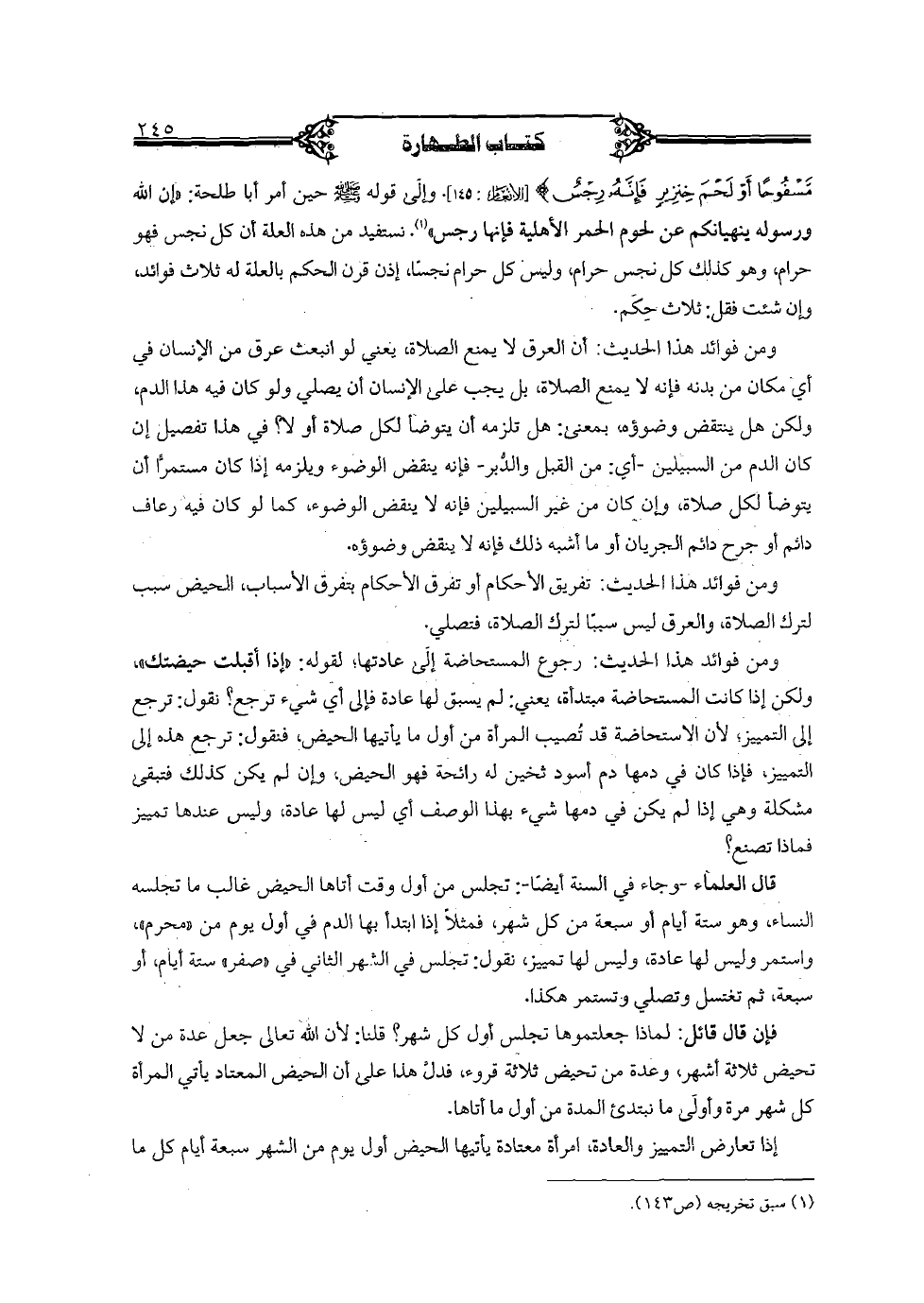 ومن فوائد هذا الحديث: رجوع المستحاضة إلى عادتها؛ لقوله: "إذا أقبلت حيضتك"، ولكن إذا كانت المستحاضة مبتدأة، يعني: لم يسبق لها عادة فإلى أي شيء ترجع؟ نقول: ترجع إلى التمييز؛ لأن الاستحاضة قد تصيب المرأة من أول ما يأتيها الحيض، فنقول: ترجع هذه إلى التمييز، فإذا كان في دمها دم أسود ثخين له رائحة فهو الحيض، وإن لم يكن كذلك فتبقى مشكلة وهي إذا لم يكن في دمها شيء بهذا الوصف أي ليس لها عادة، وليس عندها تمييز فماذا تصنع؟