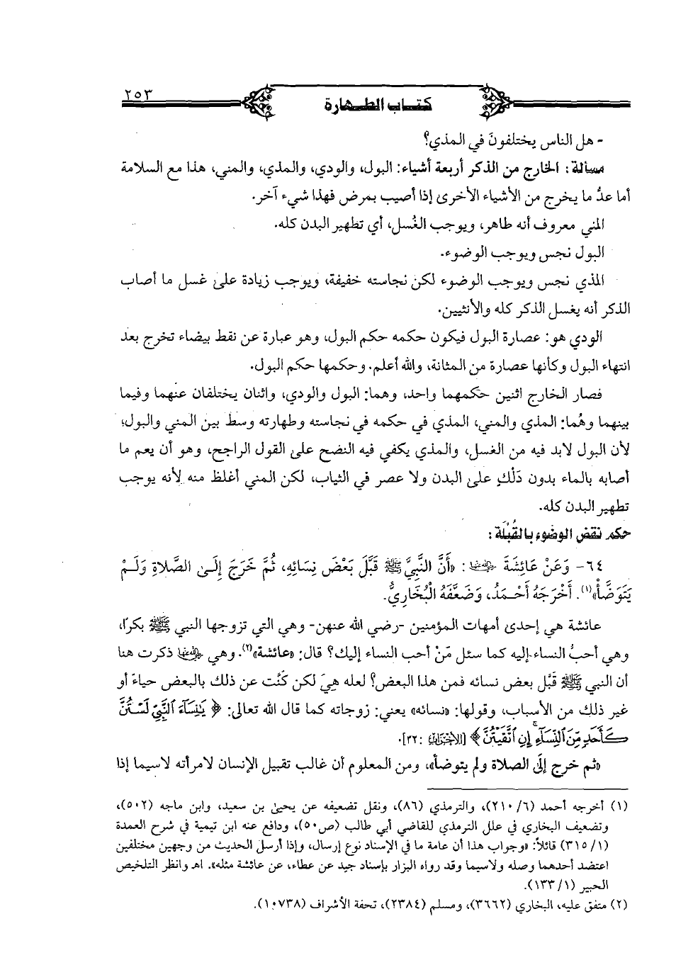 64 - وعن عائشة رضي الله عنه: "أن النبي صلى الله عليه وسلم قبل بعض نسائه، ثم خرج إلى الصلاة ولم يتوضأ". أخرجه أحمد، وضعفه البخاري.