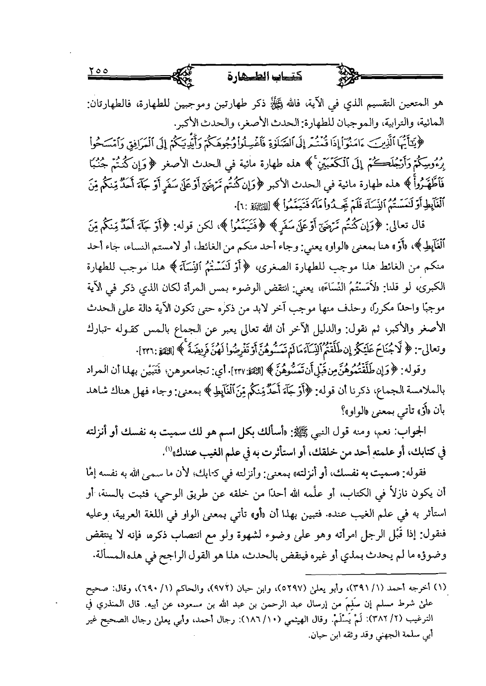 قال تعالى: {وإن كنتم مرضى أو على سفر} {فتيمموا}، لكن قوله: {أو جاء أحد منكم من الغائط}، "أو" هنا بمعنى "الواو" يعني: وجاء أحد منكم من الغائط، أو لامستم النساء، جاء أحد منكم من الغائط هذا موجب للطهارة الصغرى، {أو لمستم النساء} هذا موجب للطهارة الكبرى، لو قلنا: "لامستم النساء"، يعني: انتقض الوضوء بمس المرأة لكان الذي ذكر في الآية موجبا واحدا مكررا، وحذف منها موجب آخر لابد من ذكره حتى تكون الآية دالة على الحدث الأصغر والأكبر، ثم نقول: والدليل الآخر أن الله تعالى يعبر عن الجماع بالمس كقوله - تبارك وتعالى-: {لا جناح عليكم إن طلقتم النساء ما لم تمسوهن أو تفرضوا لهن فريضة} [البقرة: 236].