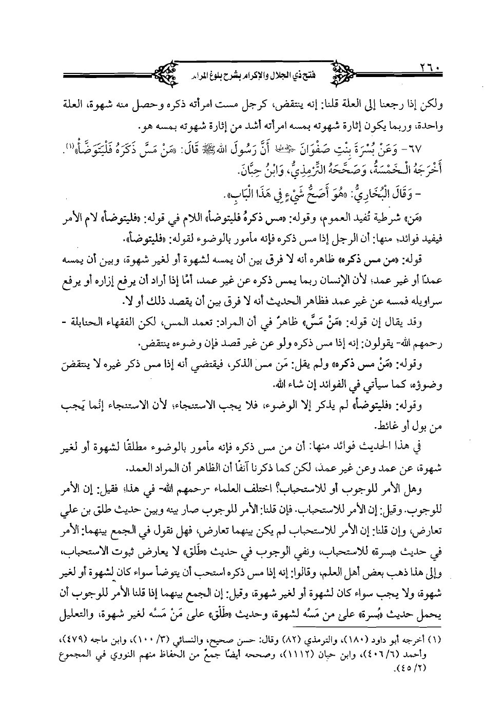 67 - وعن بسرة بنت صفوان رضي الله عنها أن رسول الله صلى الله عليه وسلم قال: "من مس ذكره فليتوضأ". أخرجه الخمسة، وصححه الترمذي، وابن حبان.