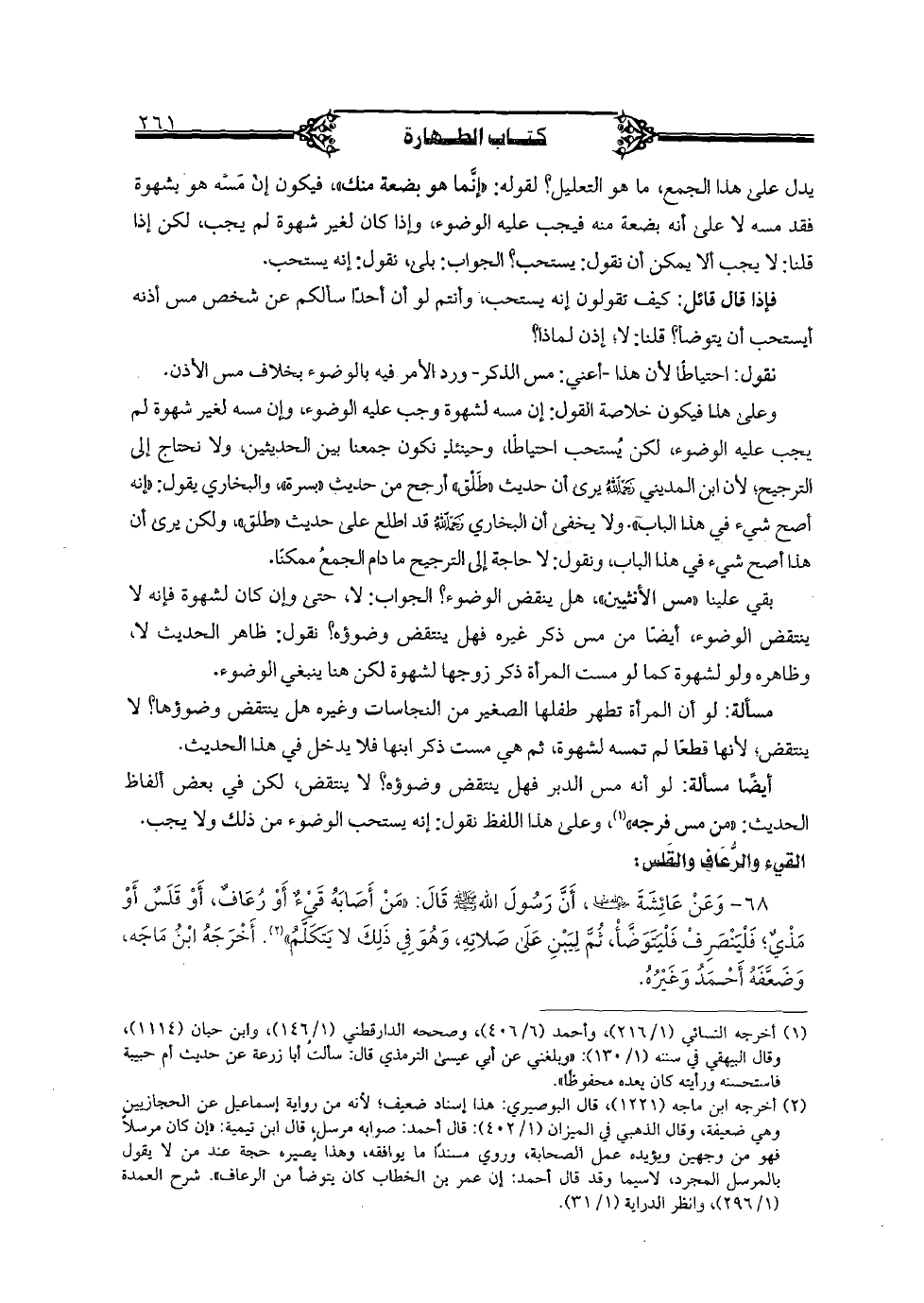 يدل على هذا الجمع، ما هو التعليل؟ لقوله: "إنما هو بضعة منك"، فيكون إن مسه هو بشهوة فقد مسه لا على أنه بضعة منه فيجب عليه الوضوء، وإذا كان لغير شهوة لم يجب، لكن إذا قلنا: لا يجب ألا يمكن أن نقول: يستحب؟ الجواب: بلى، نقول: إنه يستحب.