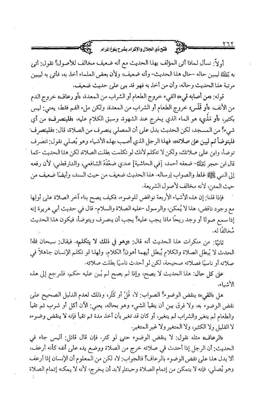 قوله: "من أصابه قيء" القيء خروج الطعام أو الشراب من المعدة، "أو رعاف" خروج الدم من الأنف، "أو قلس" خروج الطعام أو الشراب من المعدة، ولكن ملء الفم فقط؛ يعني: ليس بكثير، "أو مذي" هو الماء الذي يخرج عند الشهوة، وسبق الكلام عليه، "فلينصرف" من أي شيء؟ من المسجد، لكن الحديث يدل على أن المصلي ينصرف من الصلاة، قال: "فلينصرف فليتوضأ ثم ليبن على صلاته"، فهذا الرجل الذي أصيب بهذه الأشياء وهو يصلي نقول: انصرف توضأ، وابن على صلاتك، ولكن لا تتكلم لأنك لو تكلمت بطلت الصلاة، لكن هذا الحديث - كما قال ابن حجر رحمه الله- ضعفه أحمد، [في الحاشية] عندي ضعفه الشافعي، والداقطني؛ لأن رفعه إلى النبي صلى الله عليه وسلم غلط والصواب إرساله. هذا الحديث ضعيف من حيث السند، وأيضا ضعيف من حيث المتن؛ لأنه مخالف لأصول الشريعة.