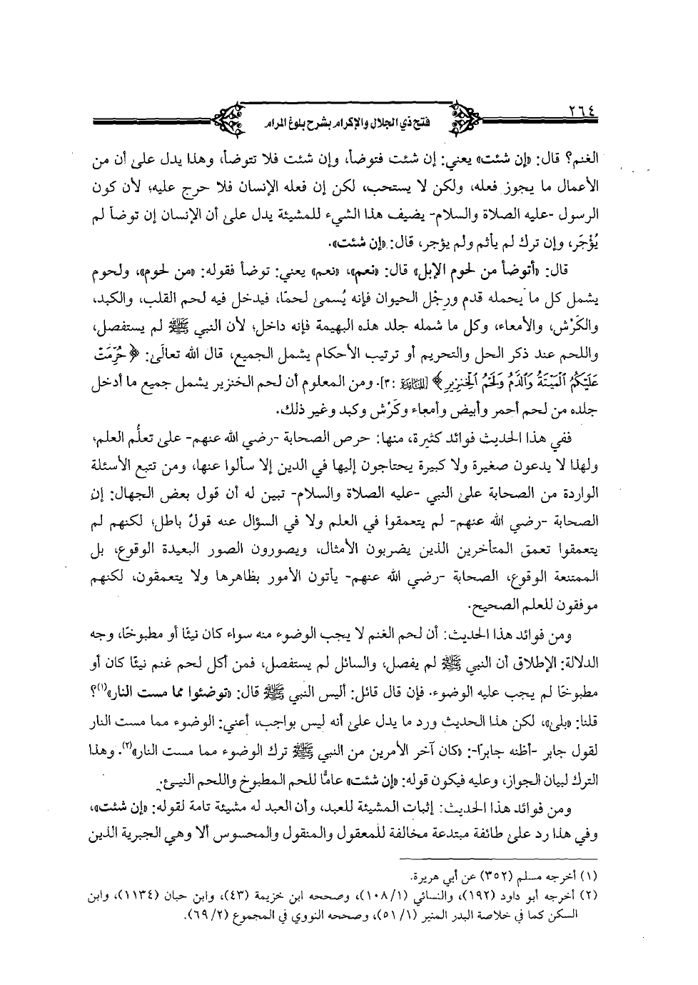 الغنم؟ قال: "إن شئت" يعني: إن شئت فتوضأ، وإن شئت فلا تتوضأ، وهذا يدل على أن من الأعمال ما يجوز فعله؛ ولكن لا يستحب، لكن إن فعله الإنسان فلا حرج عليه؛ لأن كون الرسول - عليه الصلاة والسلام- يضيف هذا الشيء للمشيئة يدل على أن الإنسان إن توضأ لم يؤجر، وإن ترك لم يأثم ولم يؤجر، قال: "إن شئت".