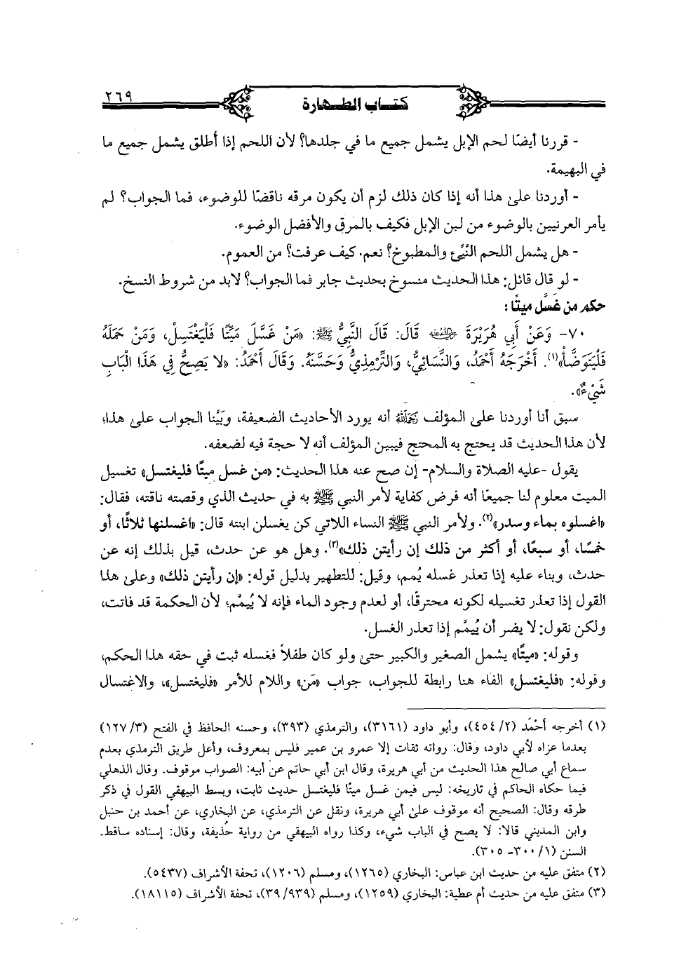 70 - وعن أبي هريرة رضي الله عنه قال: قال النبي صلى الله عليه وسلم: "من غسل ميتا فليغتسل، ومن حمله فليتوضأ". أخرجه أحمد، والنسائي، والترمذي وحسنه. وقال أحمد: "لا يصح في هذا الباب شيء.