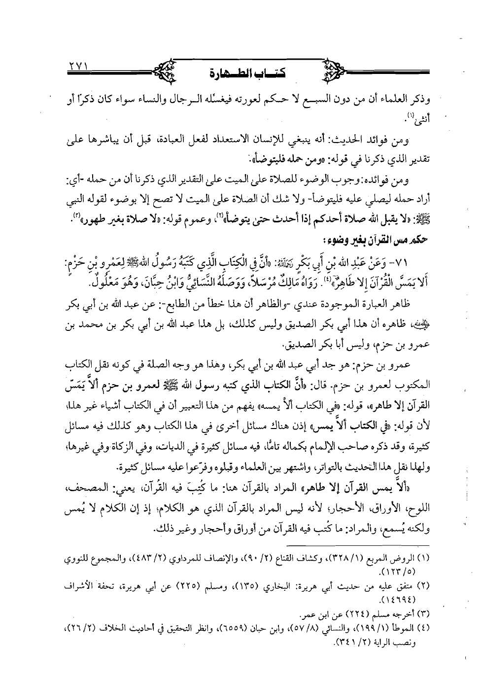 عمرو بن حزم: هو جد أبي عبد الله بن أبي بكر، وهذا هو وجه الصلة في كونه نقل الكتاب المكتوب لعمرو بن حزم. قال: "أن الكتاب الذي كتبه رسول الله صلى الله عليه وسلم لعمرو بن حزم ألا يمس القرآن إلا طاهر"، قوله: "في الكتاب ألا يمسه" يفهم من هذا التعبير أن في الكتاب أشياء غير هذا؛ لأن قوله: "في الكتاب ألا يمس" إذن هناك مسائل أخرى في هذا الكتاب وهو كذلك فيه مسائل كثيرة، وقد ذكره صاحب الإلمام بكماله تاما، فيه مسائل كثيرة في الديات، وفي الزكاة وفي غيرها؛ ولهذا نقل هذا الحديث بالتواتر، واشتهر بين العلماء وقبلوه وفرعوا عليه مسائل كثيرة.