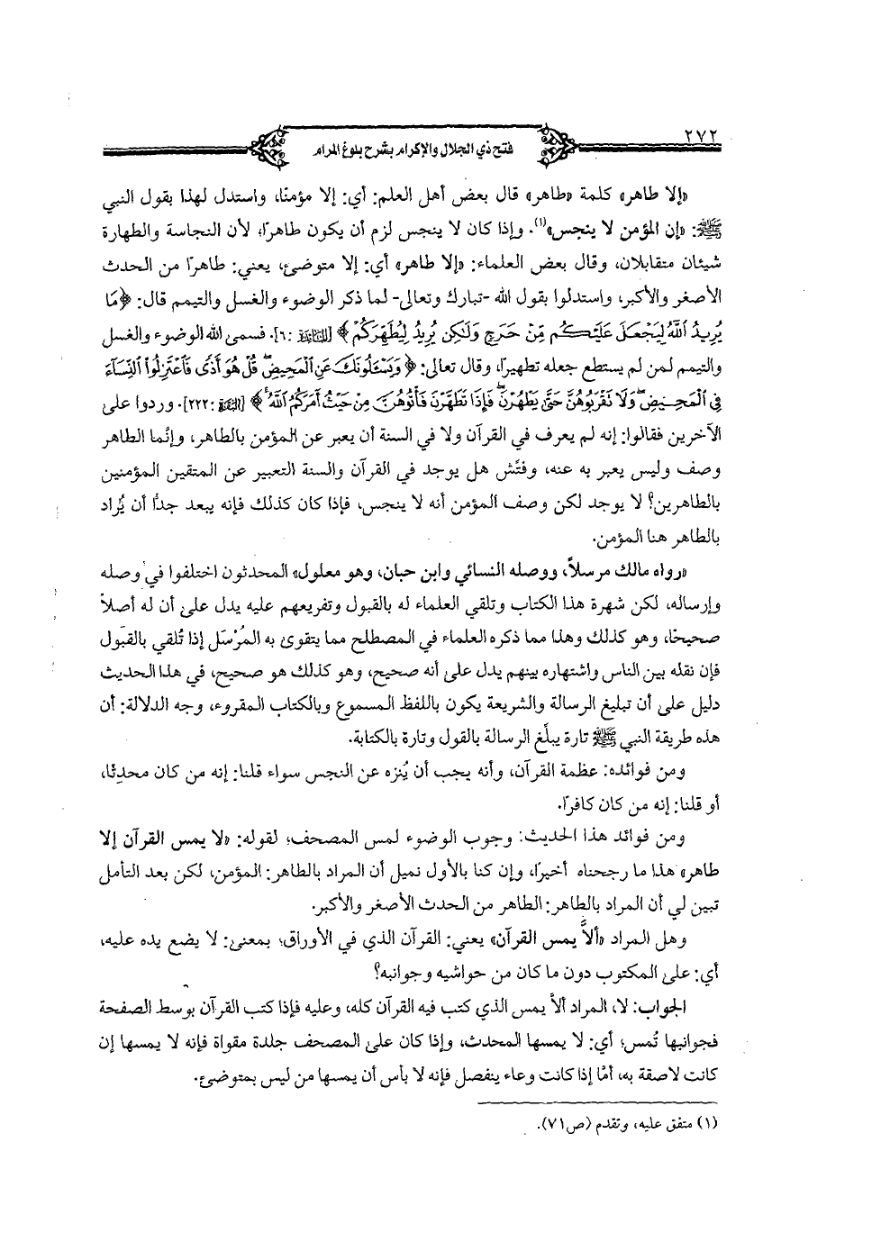"إلا طاهر" كلمة "طاهر" قال بعض أهل العلم: أي: إلا مؤمنا، واستدل لهذا بقول النبي صلى الله عليه وسلم: "إن المؤمن لا ينجس". وإذا كان لا ينجس لزم أن يكون طاهرا؛ لأن النجاسة والطهارة شيئان متقابلان، وقال بعض العلماء: "إلا طاهر" أي: إلا متوضئ، يعني: طاهرا من الحدث الأصغر والأكبر، واستدلوا بقول الله - تبارك وتعالى- لما ذكر الوضوء والغسل والتيمم قال: {ما يريد الله ليجعل عليكم من حرج ولكن يريد ليطهركم} [المائدة: 6]. فسمى الله الوضوء والغسل والتيمم لمن لم يستطع جعله تطهيرا، وقال تعالى: {ويسئلونك عن المحيض قل هو أذى فاعتزلوا النساء في المحيض ولا تقربوهن حتى يطهرن فإذا تطهرهن فأتوهن من حيث أمركم الله} [البقرة: 222]. وردوا على الآخرين فقالوا: إنه لم يعرف في القرآن ولا في السنة أن يعبر عن المؤمن بالطاهر، وإنما الطاهر وصف وليس يعبر به عنه، وفتش هل يوجد في القرآن والسنة التعبير عن المتقين والمؤمنين بالطاهرين؟ لا يوجد لكن وصف المؤمن أنه لا ينجس، فإذا كان كذلك فإنه يبعد جدا أن يراد بالطاهر هنا المؤمن.