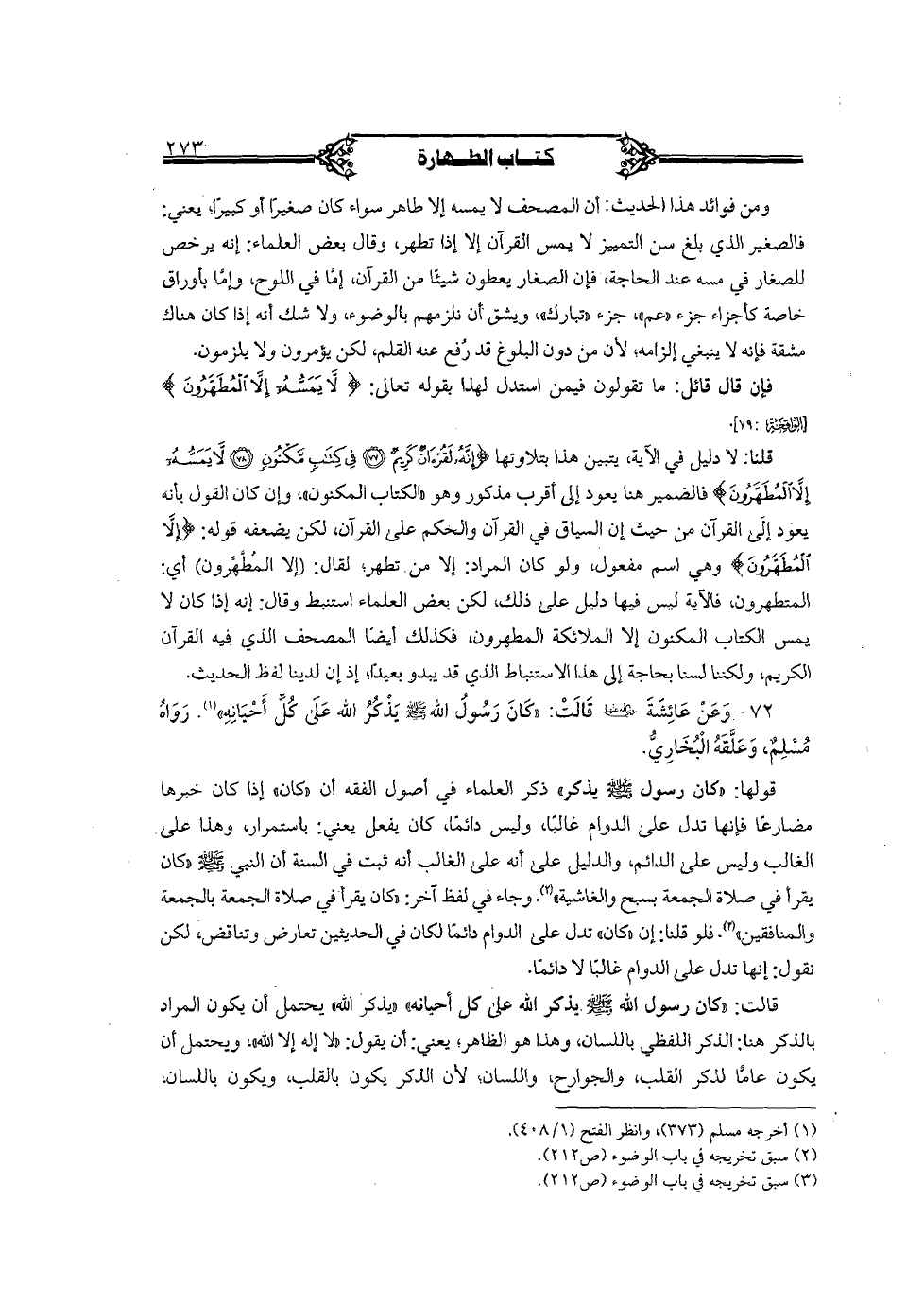 72 - وعن عائشة رضي الله عنها قالت: "كان رسول الله صلى الله عليه وسلم يذكر الله على كل أحيانه". رواه مسلم، وعلقه البخاري.