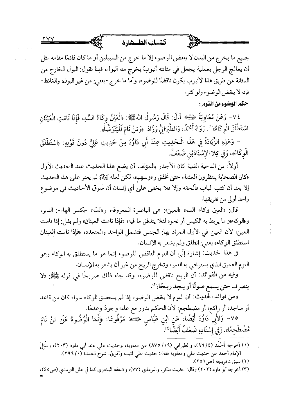 74 - وعن معاوية رضي الله عنه قال: قال رسول الله صلى الله عليه وسلم: "العين وكاء السه، فإذا نامت العينان استطلق الوكاء". رواه أحمد، والطبراني وزاد: "ومن نام فليتوضأ".