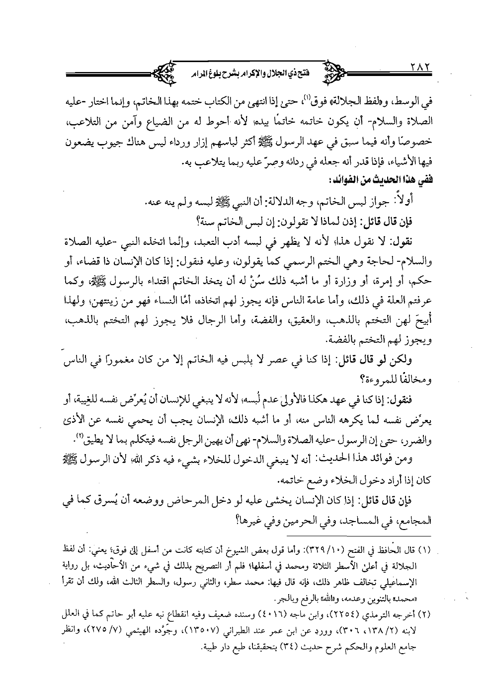 في الوسط، و"لفظ الجلالة" فوق، حتى إذا انتهى من الكتاب ختمه بهذا الخاتم، وإنما اختار - عليه الصلاة والسلام- أن يكون خاتمه خاتما بيده؛ لأنه أحوط له من الضياع وآمن من التلاعب، خصوصا وأنه فيما سبق في عهد الرسول صلى الله عليه وسلم أكثر لباسهم إزار ورداء ليس هناك جيوب يضعون فيها الأشياء، فإذا قدر أنه جعله في ردائه وصر عليه ربما يتلاعب به.