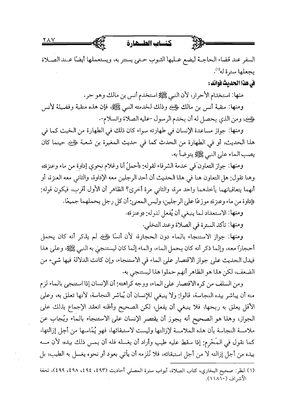 ومن السلف من كره الاقتصار على الماء، ووجه كراهته، أن الإنسان إذا استنجى بالماء لزم منه ان يباشر بيده النجاسة، قالوا: ولا ينبغي للإنسان أن يباشر النجاسة؛ لأنها تعلق به، وعلى الأقل يعلق به ريحها، فلا ينبغي أن يفعل؛ لكن الصحيح وأظنه انعقد الإجماع بذلك على الجواز، وهذا هو الصحيح أنه يجوز أن يقتصر الإنسان على الاستنجاء بالماء ويجاب عن ملامسة النجاسة بأن هذه الملامسة لإزالتها وليست لاستبقائها، فهو يماسها من أجل غزالتها، كما نقول في المحرم: إذا سقط عليه طيب وأراد أن يغسله فله أن يمس ذلك بيده؛ لأن مسه بيده من أجل إزالته لا من أجل استبقائه، فلا نلزمه أن يأتي بعود أو نحوه يغسل به الطيب، بل