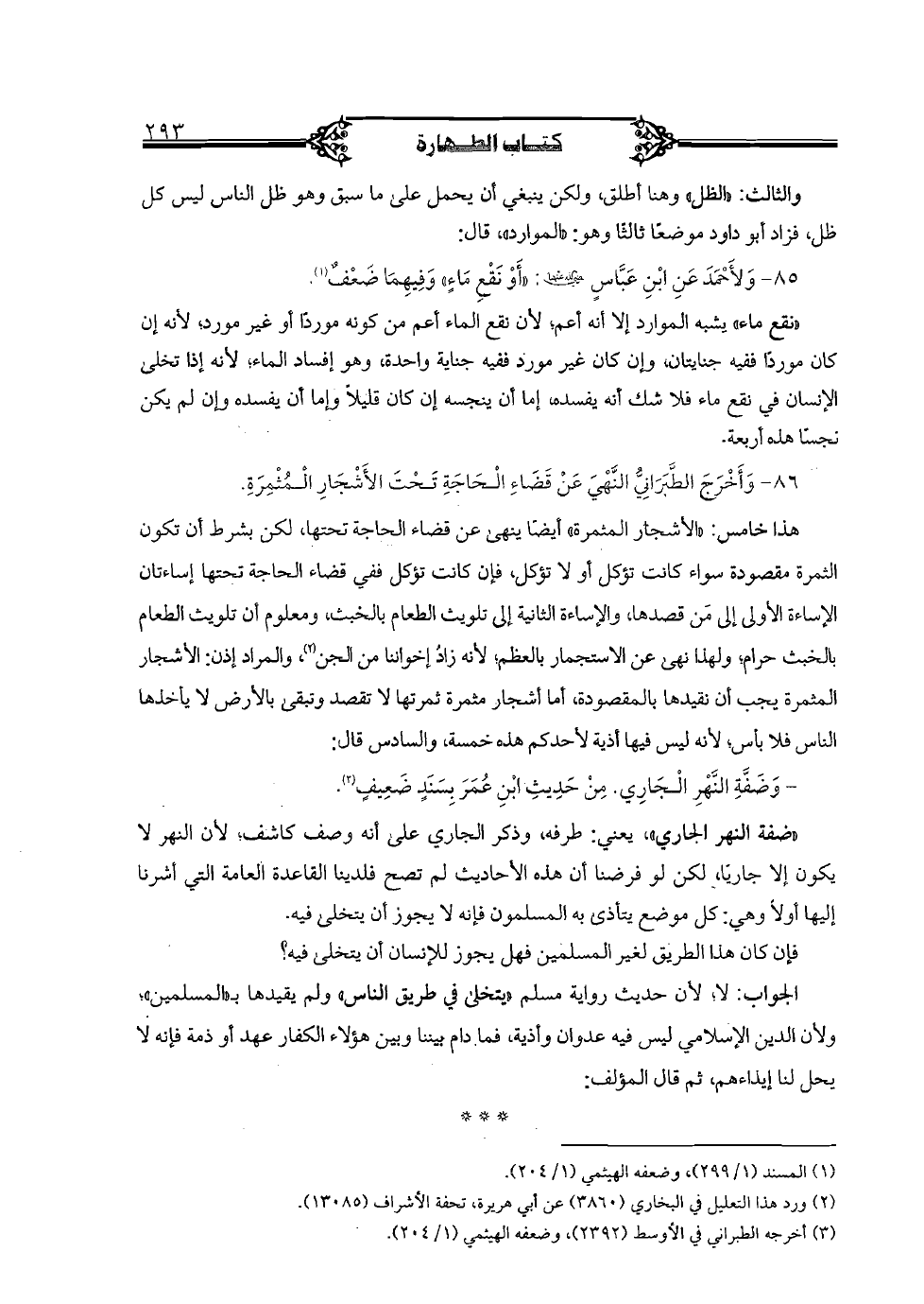 - "ضفة النهر الجاري"، يعني: طرفه، وذكر الجاري على أنه وصف كاشف؛ لأن النهر لا يكون إلا جاريا، لكن لو فرضنا أن هذه الأحاديث لم تصح فلدينا القاعدة العامة التي أشرنا إليها أولا وهي: كل موضع يتأذى به المسلمون فإنه لا يجوز أن يتخلى فيه.