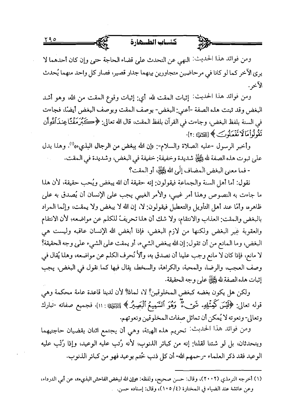 وأخبر الرسول - عليه الصلاة والسلام-: "إن الله يبغض من الرجال البذيء". وهذا يدل على ثبوت هذه الصفة لله عز وجل شديدة وخفيفة: خفيفة في البغض، وشديدة في المقت.