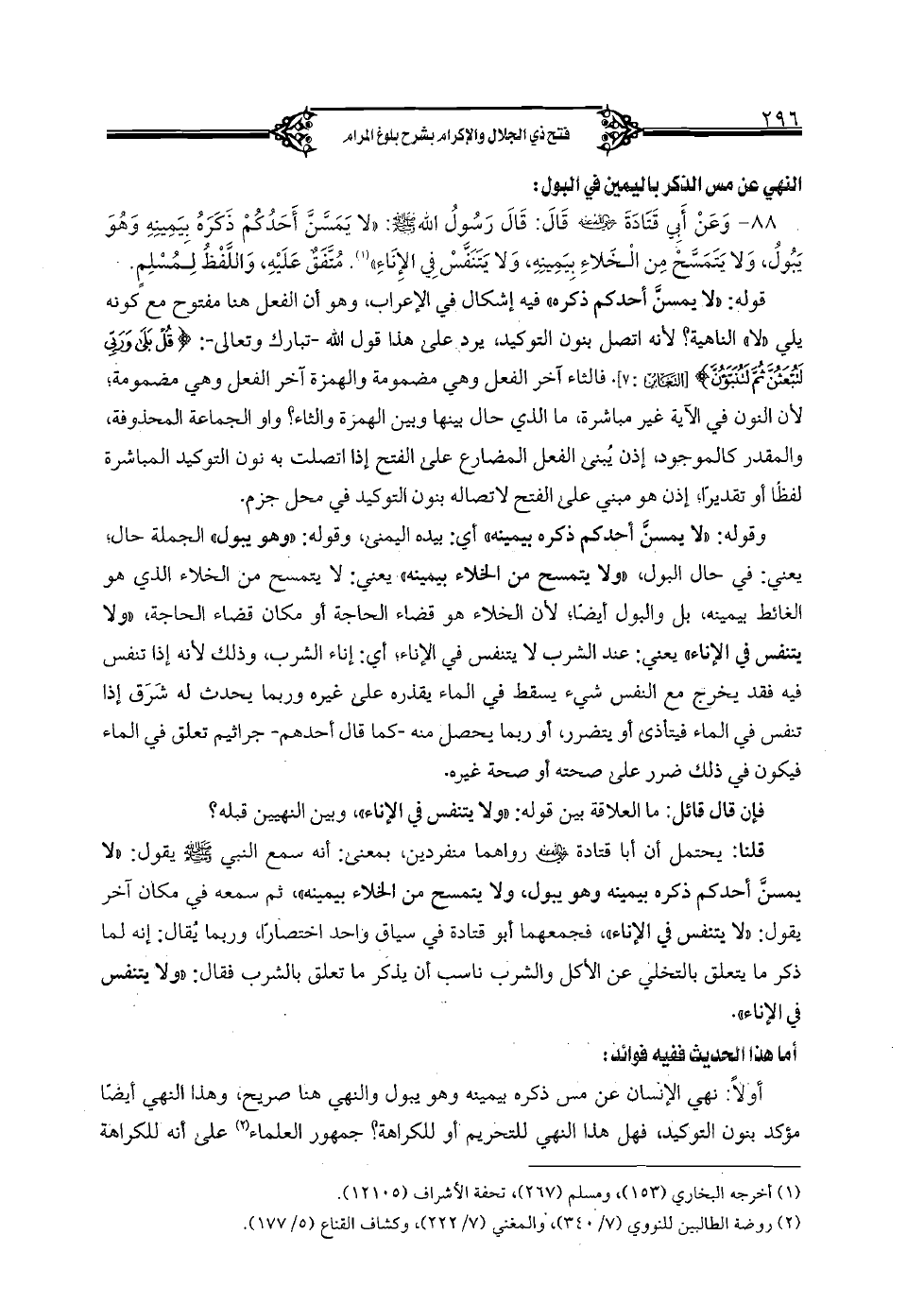 أولا: نهي الإنسان عن مس ذكره بيمينه وهو يبول والنهي هنا صريح، وهذا النهي أيضا مؤكد بنون التوكيد، فهل هذا النهي للتحريم أو للكراهة؟ جمهور العلماء على أنه للكراهة