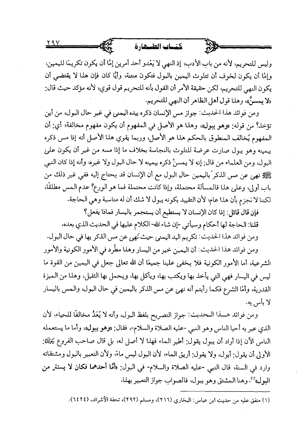 ومن فوائد هذا الحديث: أن اليمين خير من اليسار وهذا مطرد في الأمر الكونية والأمور الشرعية، أما الأمور الكونية فلا يخفى علينا جميعا أن الله تعالى جعل في اليمين من القوة ما ليس في اليسار فهي التي يأخذ بها ويكتب بها، ويأكل بها، ويحمل بها الثقيل، وهذا من الميزة القدرية، وأما الشرع فكما رأيتم أنه نهى عن مس الذكر باليمين في حال البول، والمس باليسار لا بأس به.