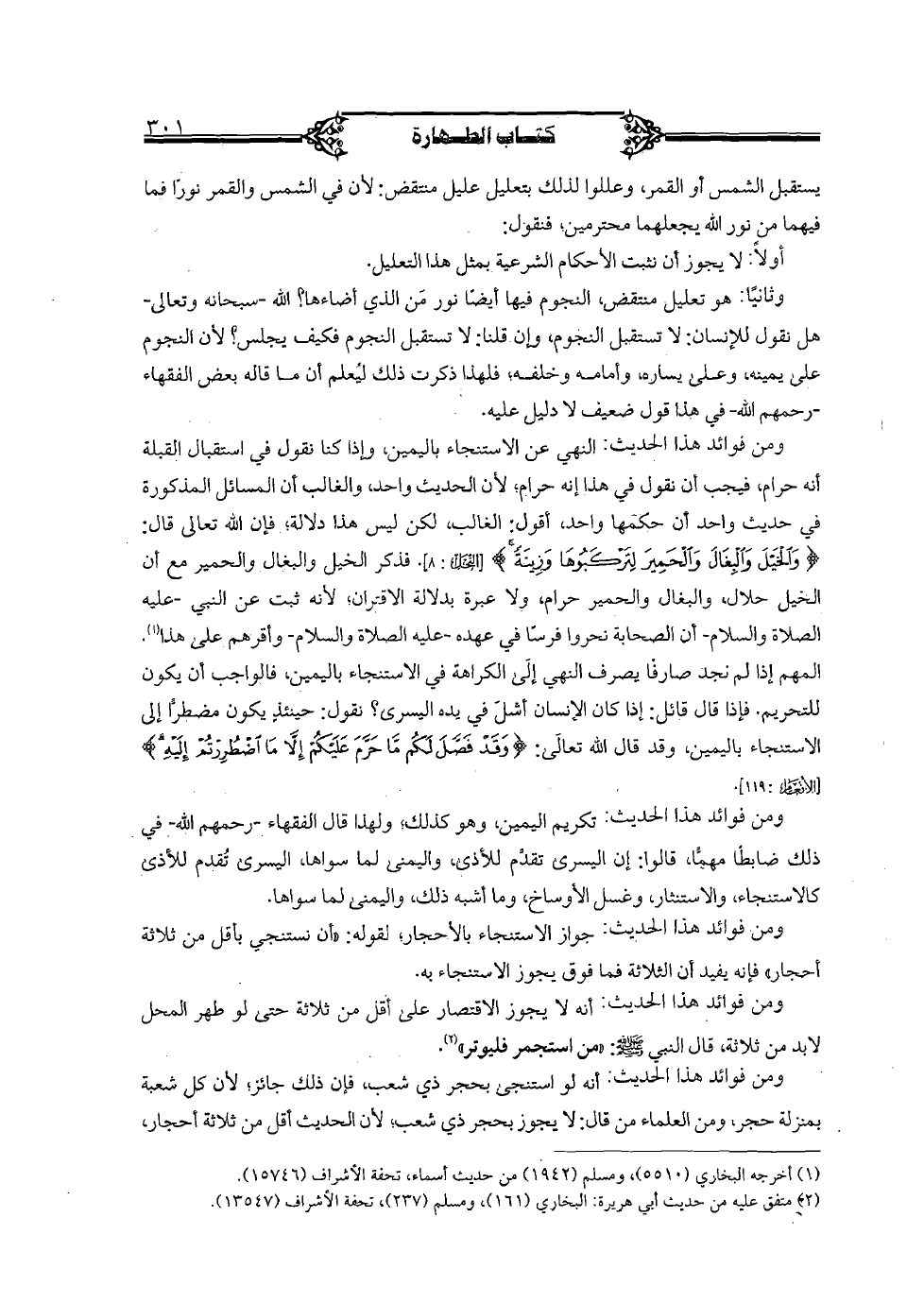 ومن فوائد هذا الحديث: النهي عن الاستنجاء باليمين، وإذا كنا نقول في استقبال القبلة أنه حرام، فيجب أن نقول في هذا إنه حرام؛ لأن الحديث واحد، والغالب أن المسائل المذكورة في حديث واحد أن حكمها واحد، أقول: الغالب، لكن ليس هذا دلالة؛ فإن الله تعالى قال: {والخيل والبغال والحمير لتركبوها وزينة} [النحل: 8]. فذكر الخيل والبغال والحمير مع أن الخيل جلال، والبغال والحمير حرام، ولا عبرة بدلالة الاقتران؛ لأنه ثبت عن النبي - عليه الصلاة والسلام- أن الصحابة نحروا فرسا في عهده - علي الصلاة والسلام- وأقرهم على هذا.